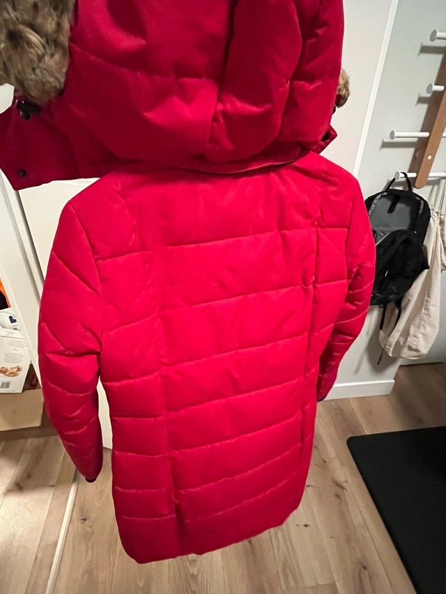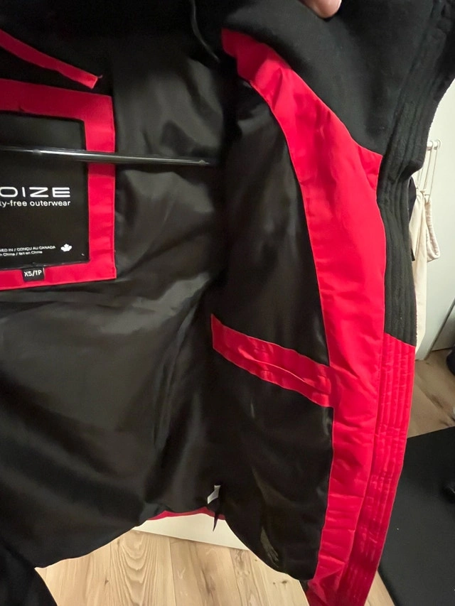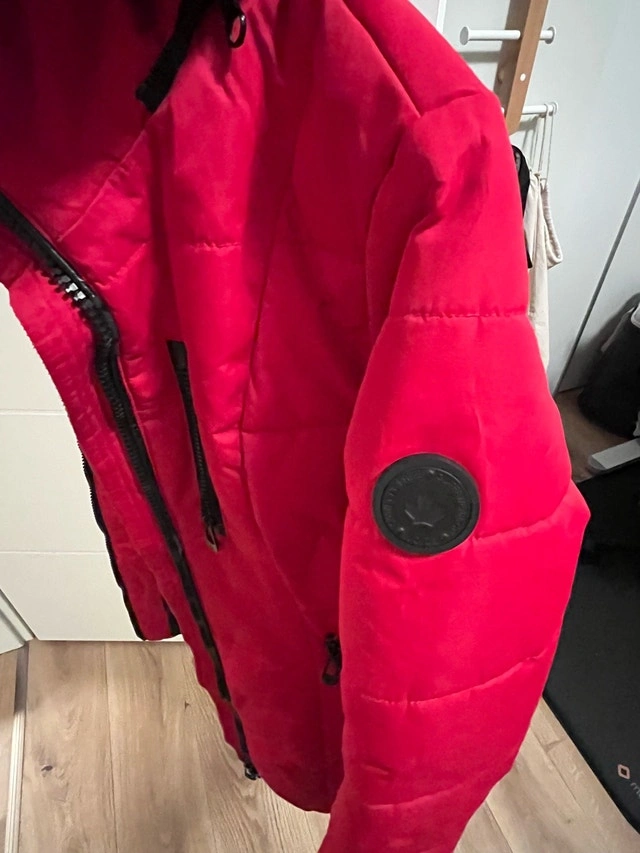 Selling a NOIZE winter jacket in bright red. Warm, insulated puffer-style coat with a hood, great for winter. Overall in good condition and still very wearable. Please note: The hanging loop/hook is broken. There is some wear on the leather trim near the zipper (purely cosmetic, zipper works fine). Details: Brand: NOIZE, Color: Red with black lining, Size: X-Small. Zipper closure with pockets. Clean and well cared for. Selling as it doesn’t fit me anymore. Open to reasonable offers. Pet free and smoke free home.