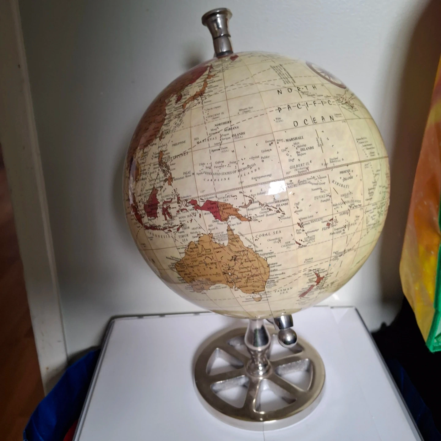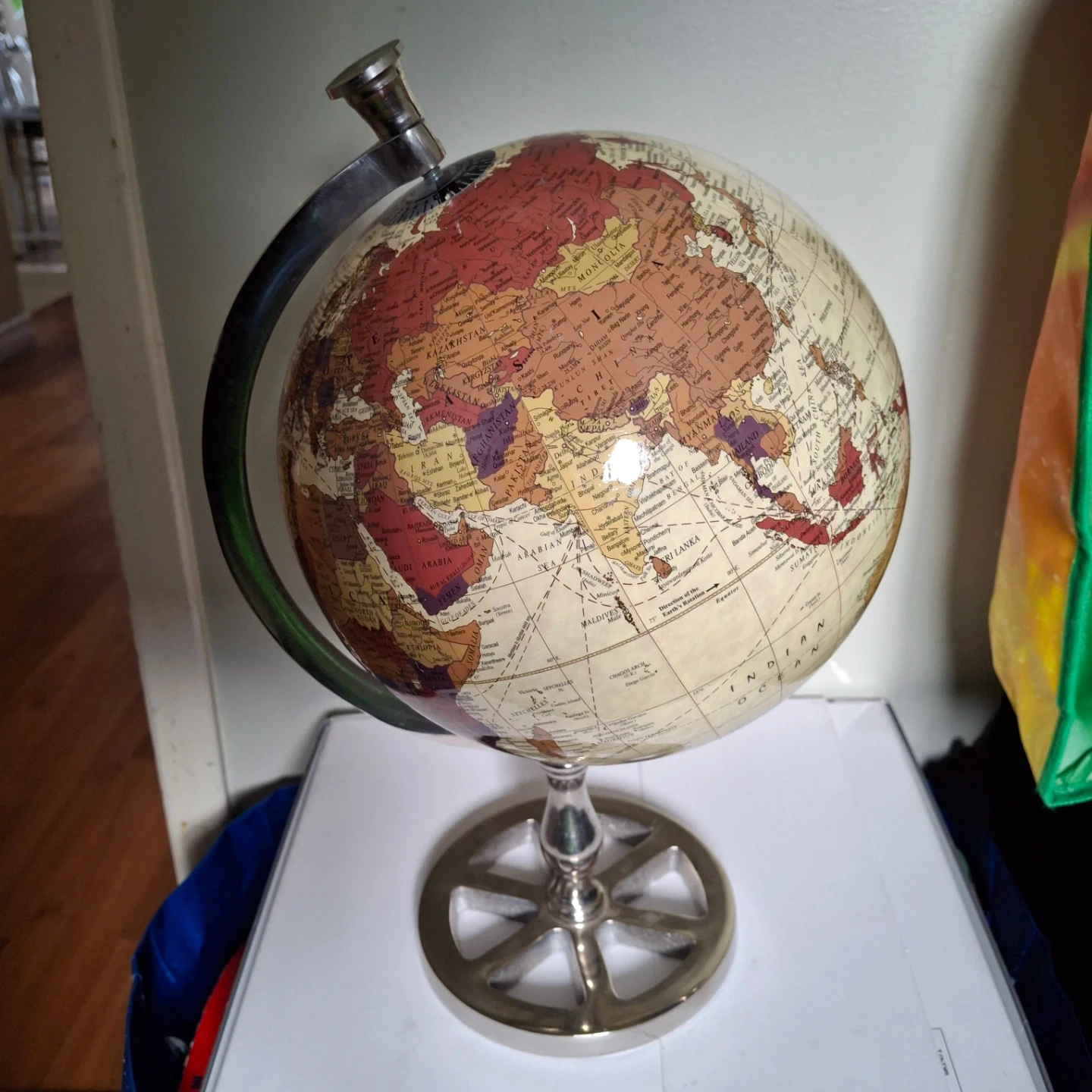 This is a decorative desk globe featuring a vintage-style map. It has a metal stand with a round base. The globe shows continents, countries, and oceans.