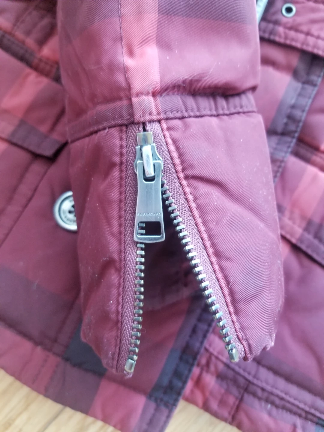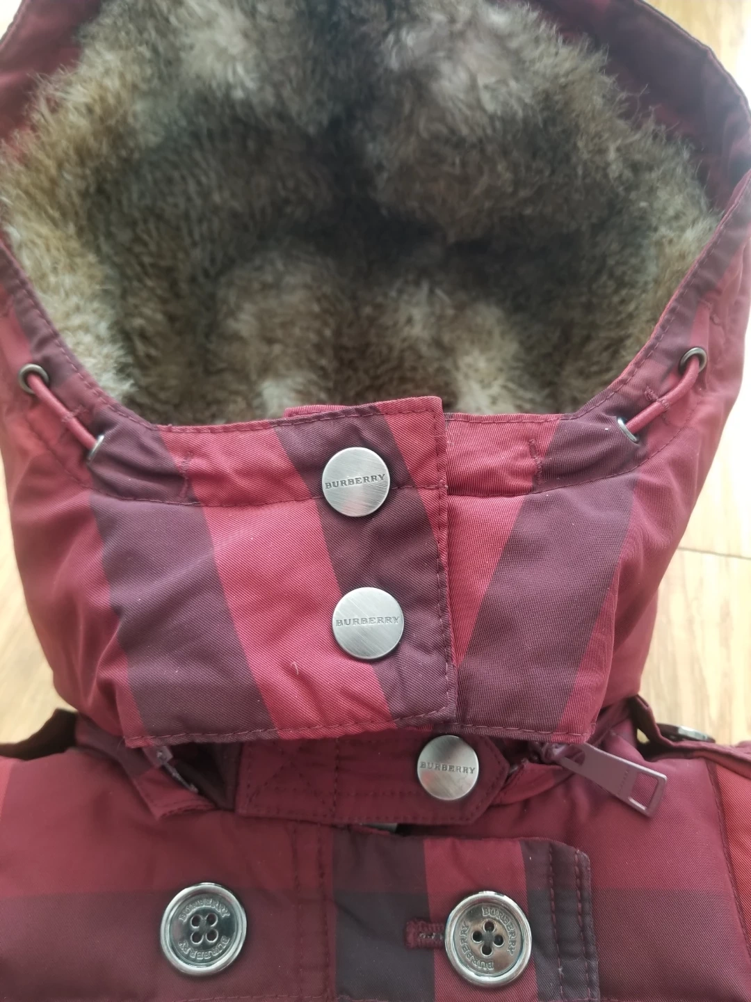 Burberry Children's down puffer jacket in a classic plaid pattern. It features a removable hood with faux fur trim and a tie belt at the waist. Front button and zip closure with multiple pockets. Small stain on left sleeve. Otherwise excellent co edition.