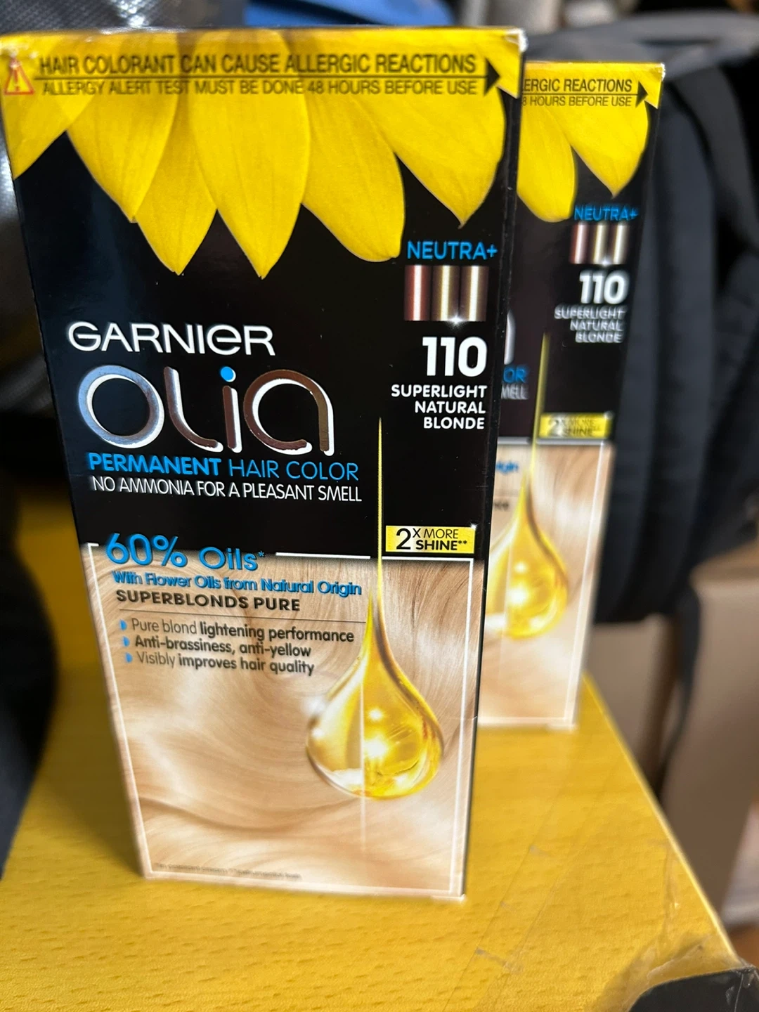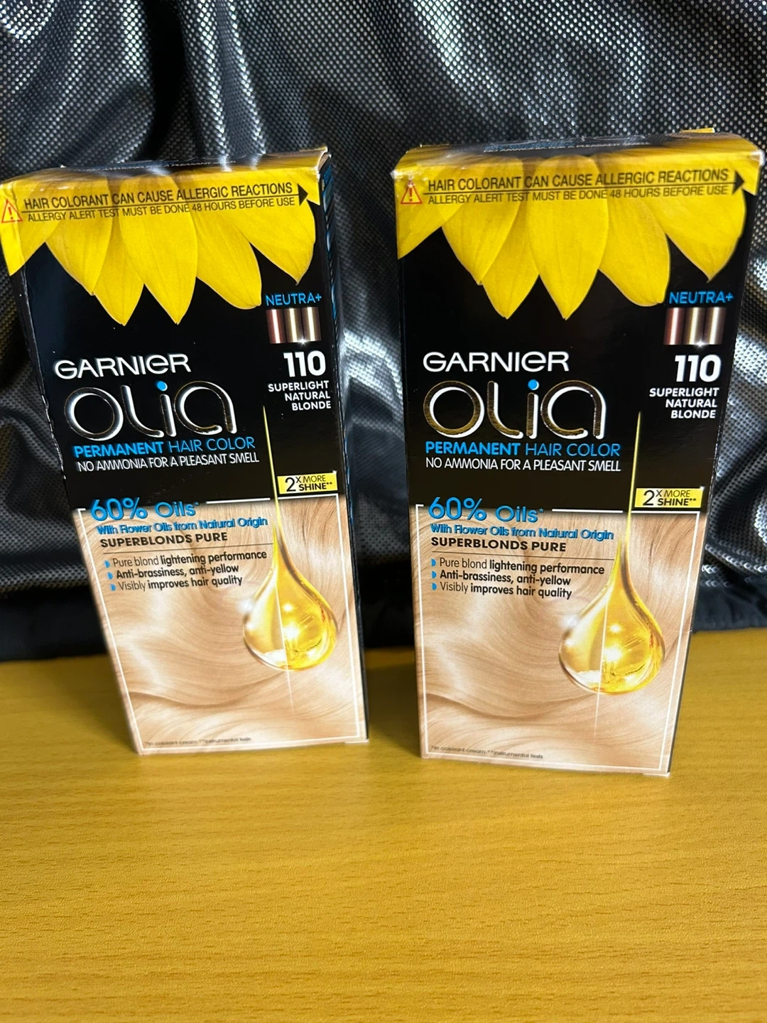 This is Garnier Olia permanent hair color in shade 110 Superlight Natural Blonde. It's oil powered and ammonia-free for a pleasant smell. The formula uses 60% oils with flower extracts for pure blond lightening performance, anti-brassiness, and improved hair quality. Two boxes are included.
