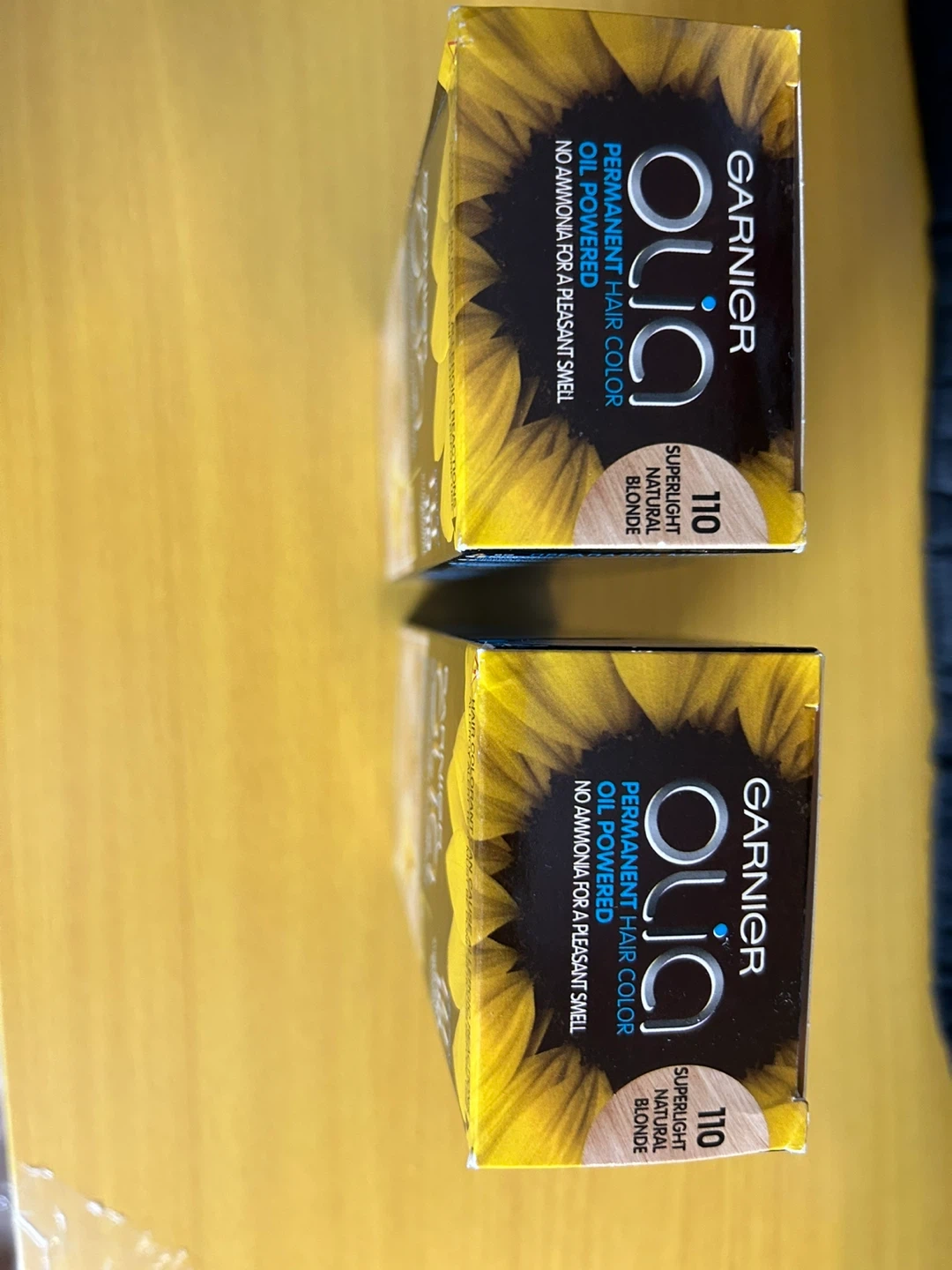 This is Garnier Olia permanent hair color in shade 110 Superlight Natural Blonde. It's oil powered and ammonia-free for a pleasant smell. The formula uses 60% oils with flower extracts for pure blond lightening performance, anti-brassiness, and improved hair quality. Two boxes are included.