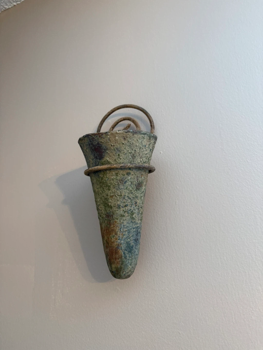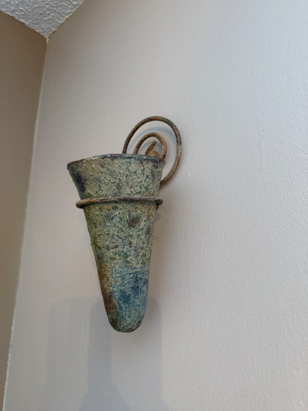 This is a rustic wall-mounted planter or holder. It's made from a textured material with a greenish-blue patina and features a coiled metal accent for hanging. It's great for small plants or decorative items!