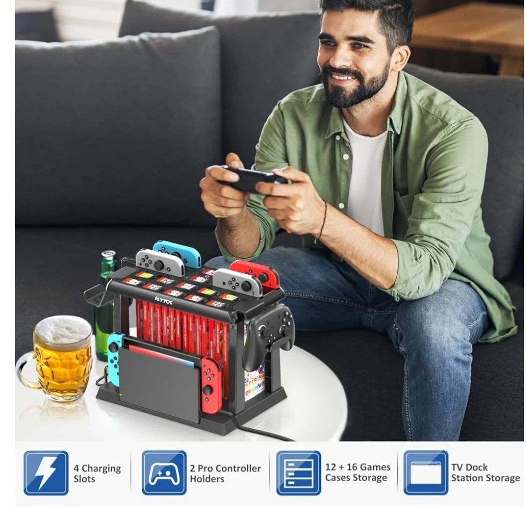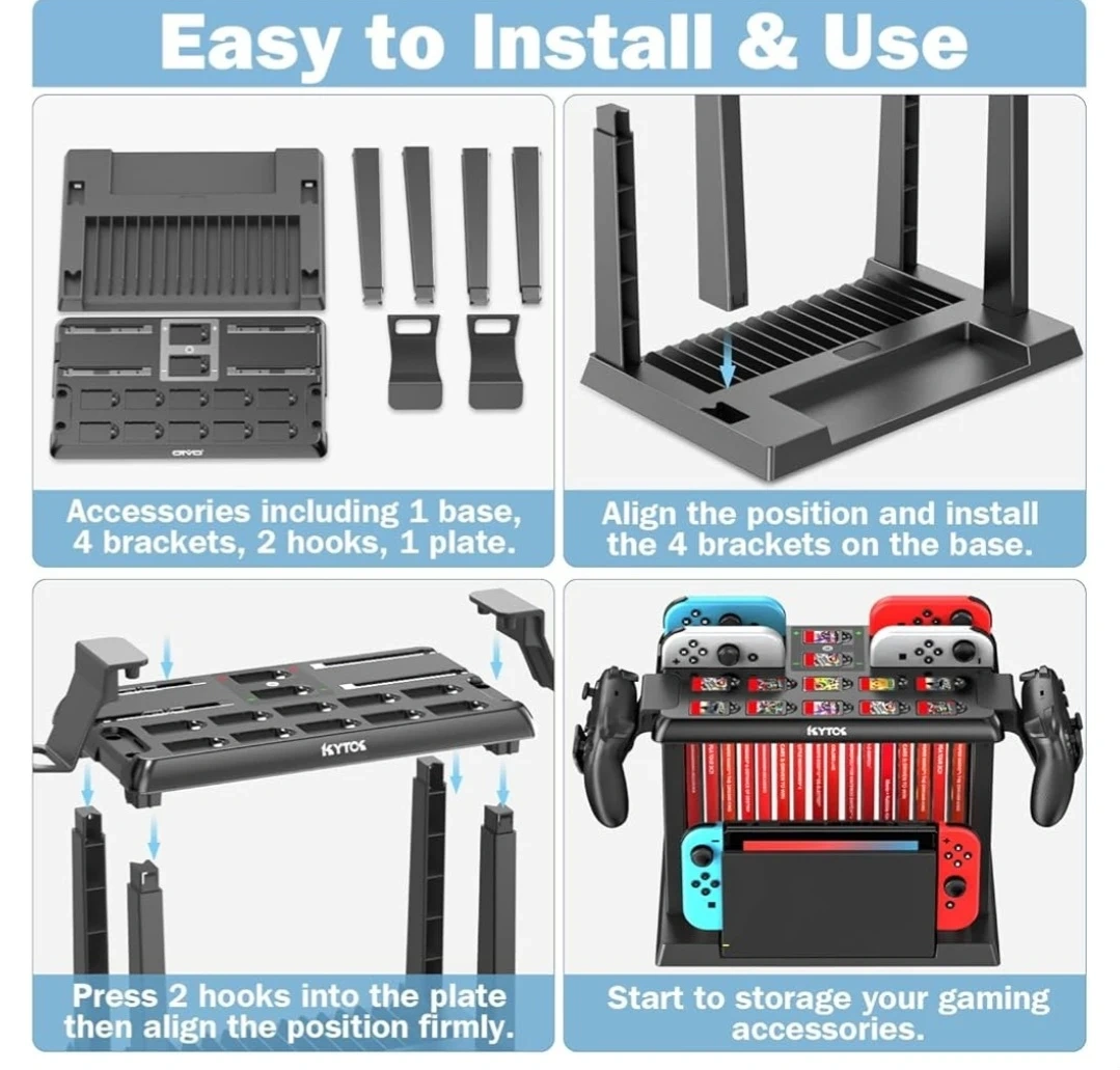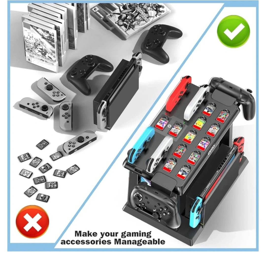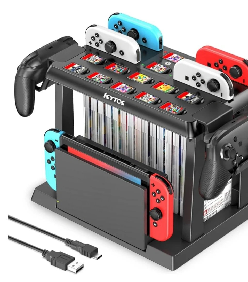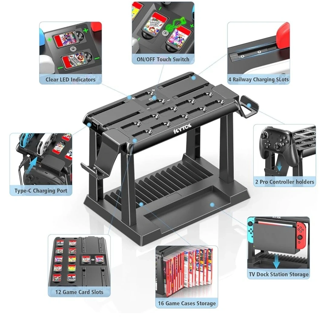 ALL-IN-ONE SWITCH ORGANIZER – In addition to charging 6 joycons, the Kytok Switch Storage Tower is upgraded with powerful storage space, including 28 game cards, 2 Pro controllers and your favorite OLED Switch dock. Versatile design, extra storage space for Nintendo Switch to make your gaming space neat and tidy.