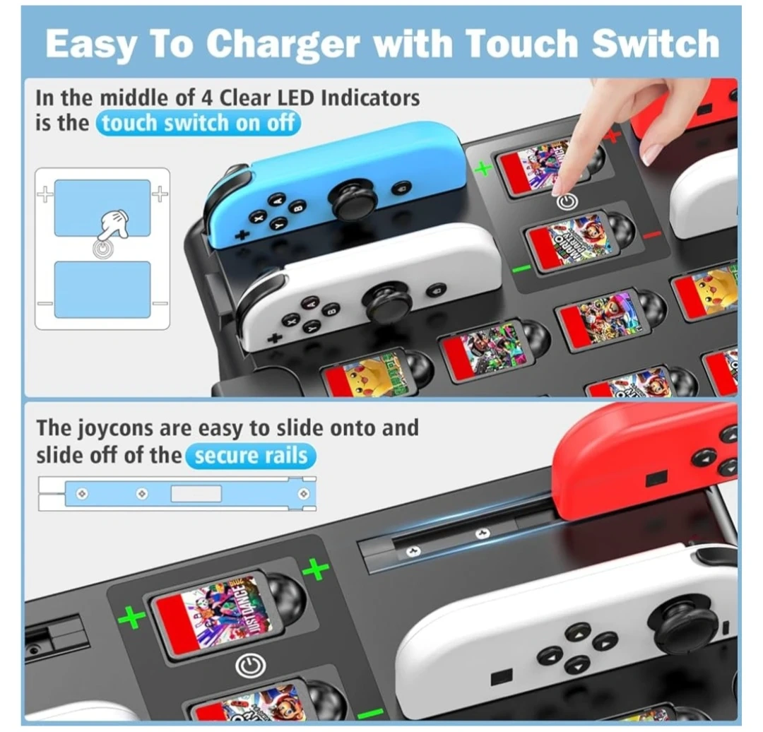 2 Hours Fast Charging Station - With touch on/off button and rail charging slots, the charging station of the switch charge 4 joycons in 2 hours. As long as the power above 5V/1.5A can charge, the Joycon Switch charger has various charging methods, including a switch or OLED console, wall adapter, hub or PC. For the LED indicator on the charger for multiple joycons for the switch, red means charging and green means charging or standby