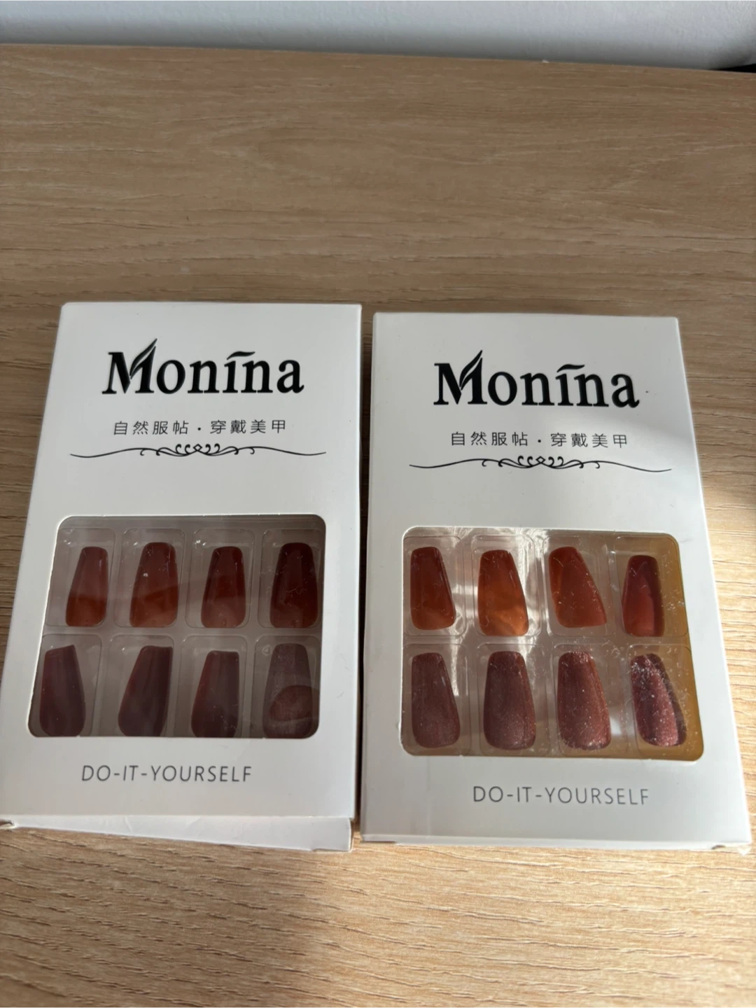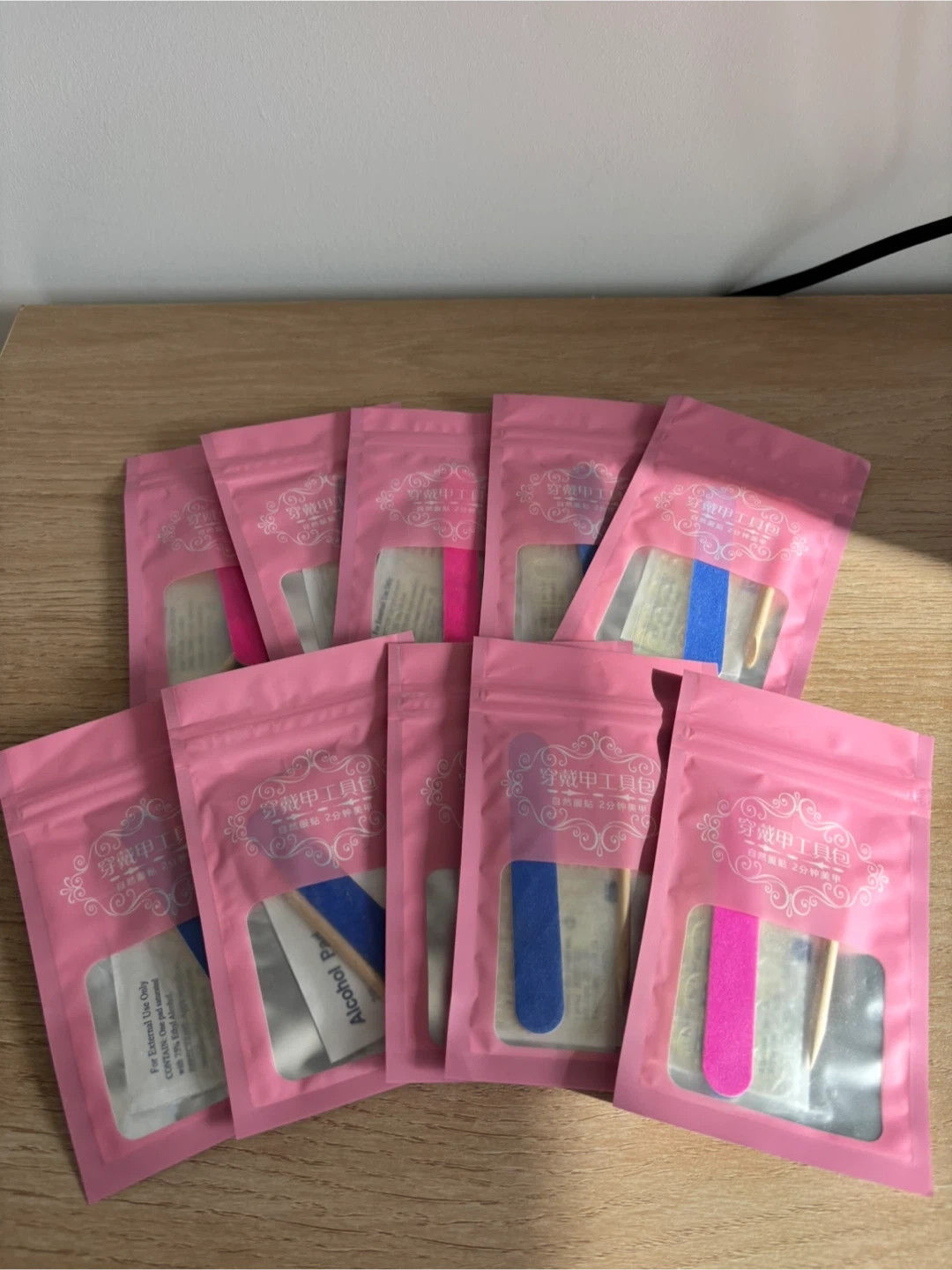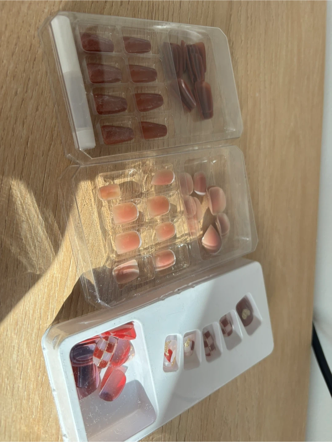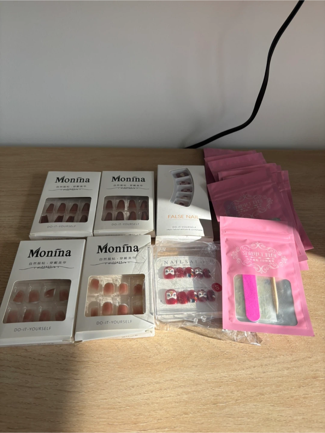 This set includes 6 boxes of false nails press ons with various designs and sizes. They're easy to apply at home. Comes with 10 packs of adhesive tabs and nail files. All new!