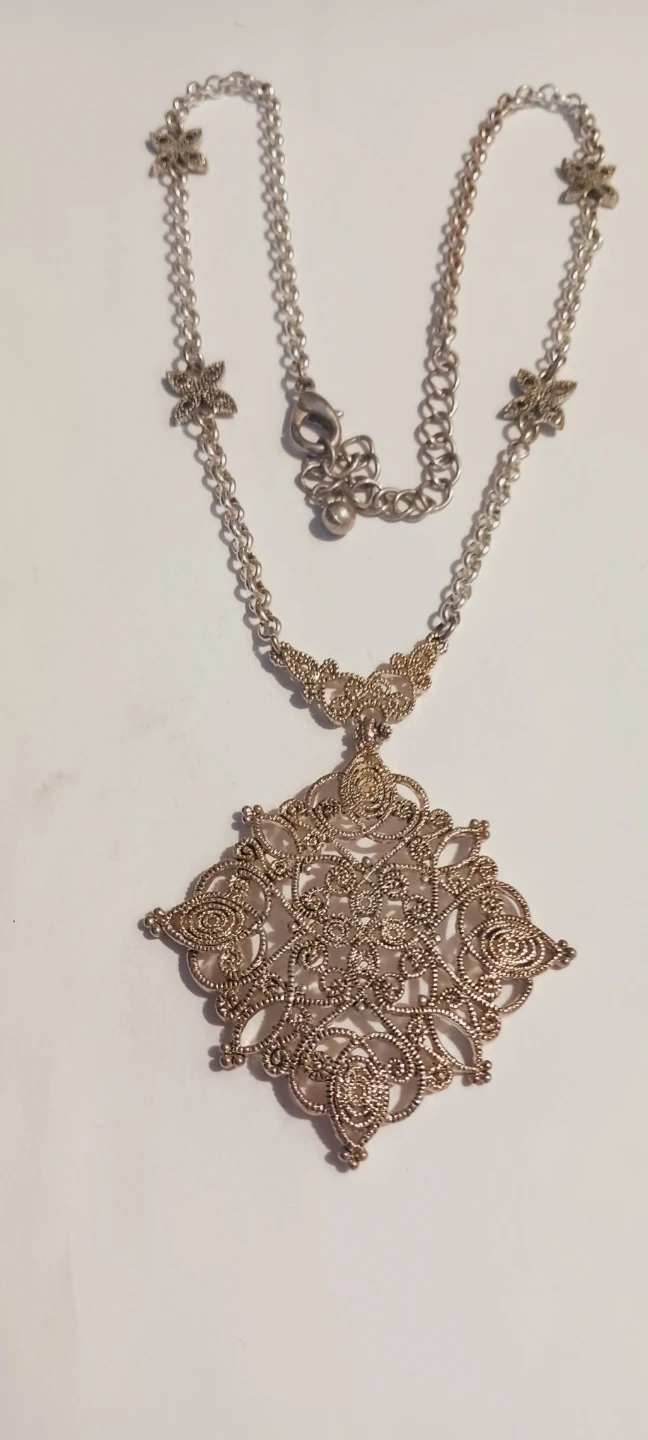 This necklace features an ornate, diamond-shaped filigree pendant with intricate scrollwork. It has a delicate chain with small decorative accents. It's an eye-catching accessory for any outfit!! 20" long. ALL MY PRICES ARE NEGOTIABLE !!