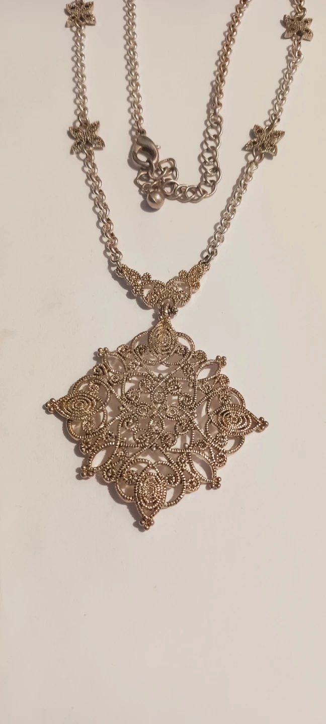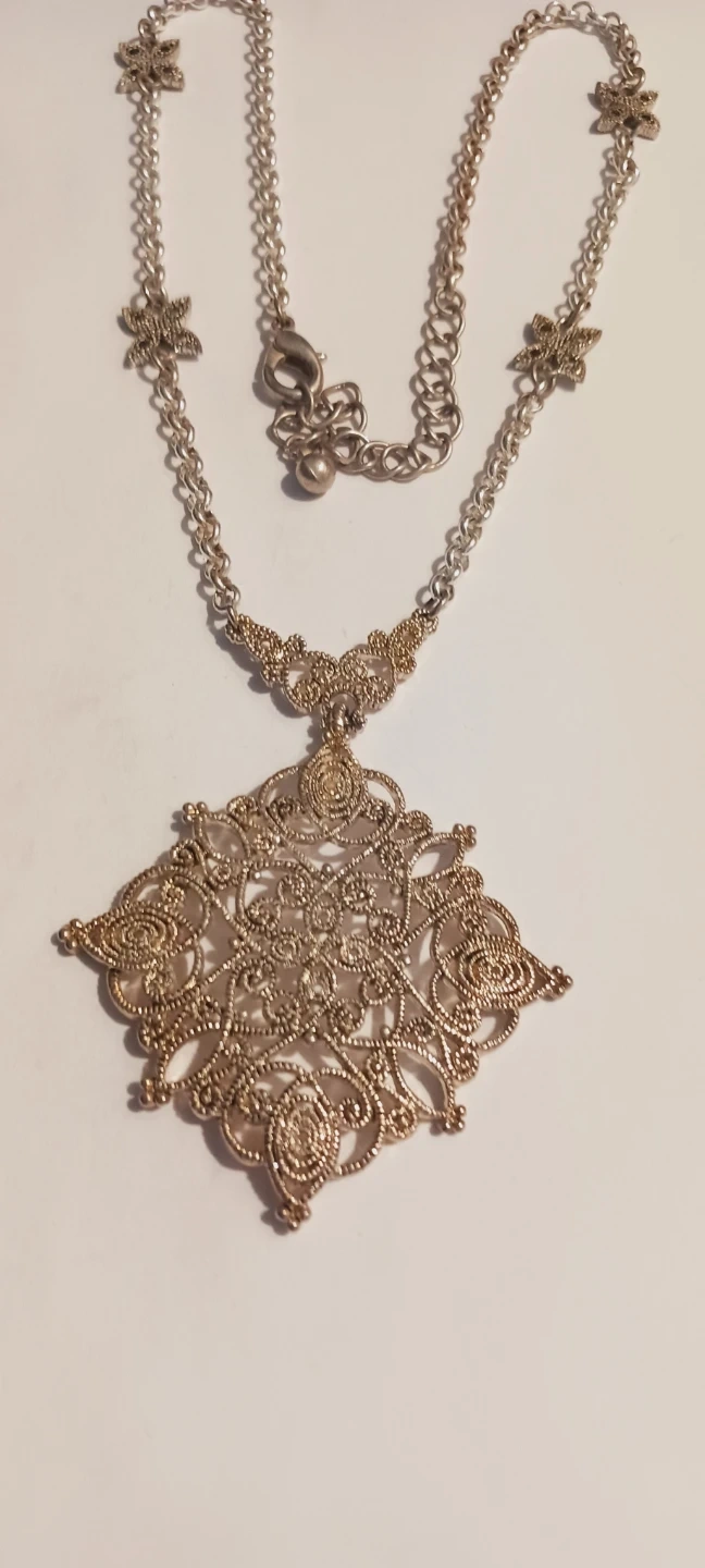 This necklace features an ornate, diamond-shaped filigree pendant with intricate scrollwork. It has a delicate chain with small decorative accents. It's an eye-catching accessory for any outfit!! 20" long. ALL MY PRICES ARE NEGOTIABLE !!