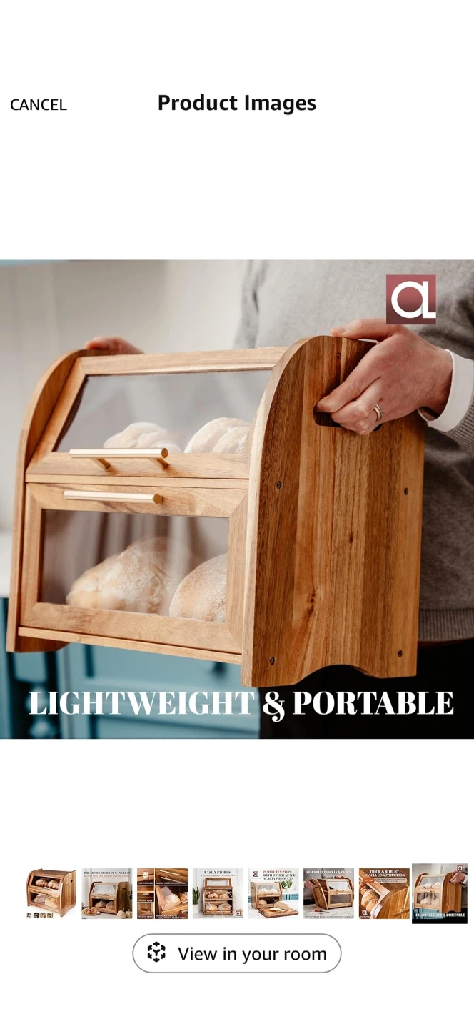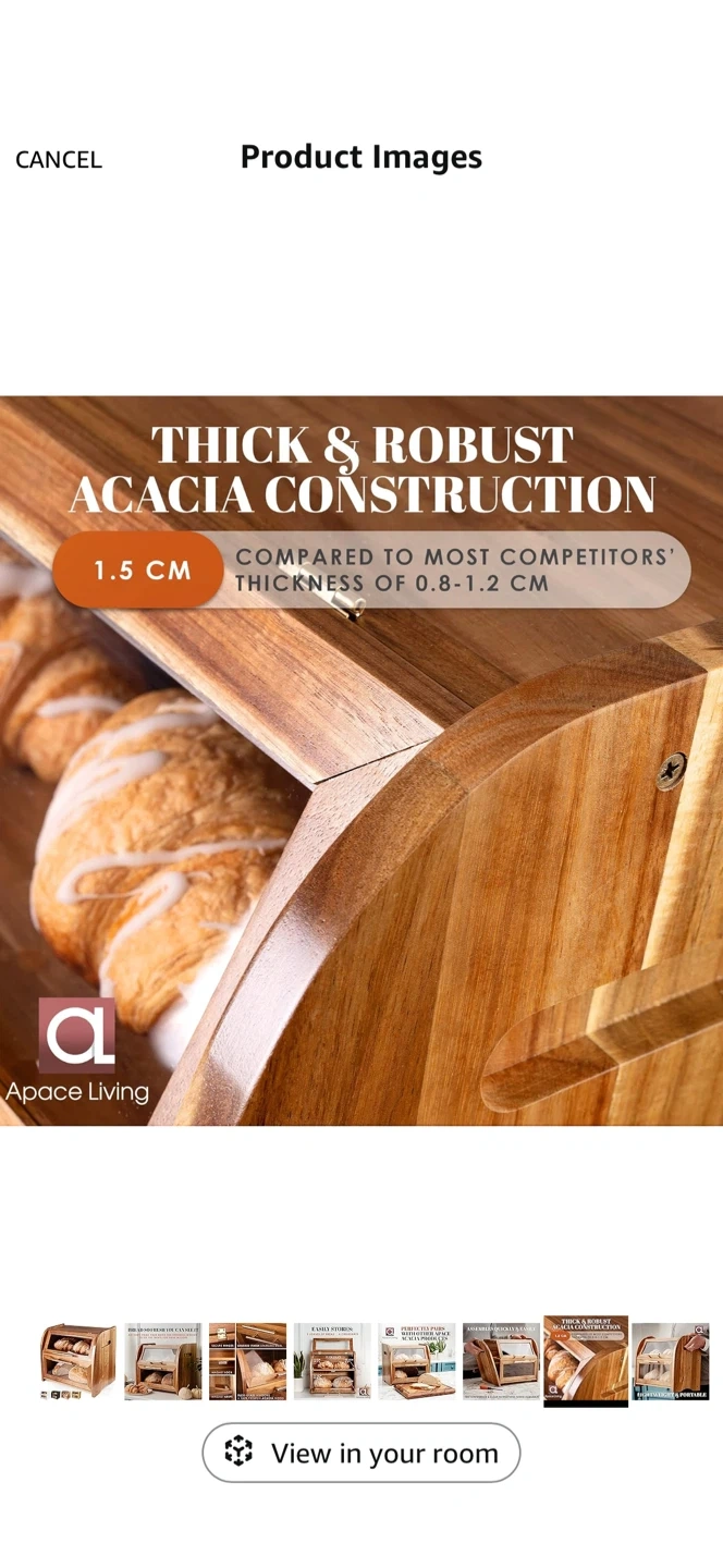 Thick & robust acacia wood construction. It features secure hinges, a magnet lock, and brushed finish stainless steel handles. Plexi-glass windows allow easy viewing of contents. This bread box easily stores 2 loaves of bread or 6 croissants.