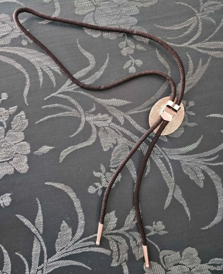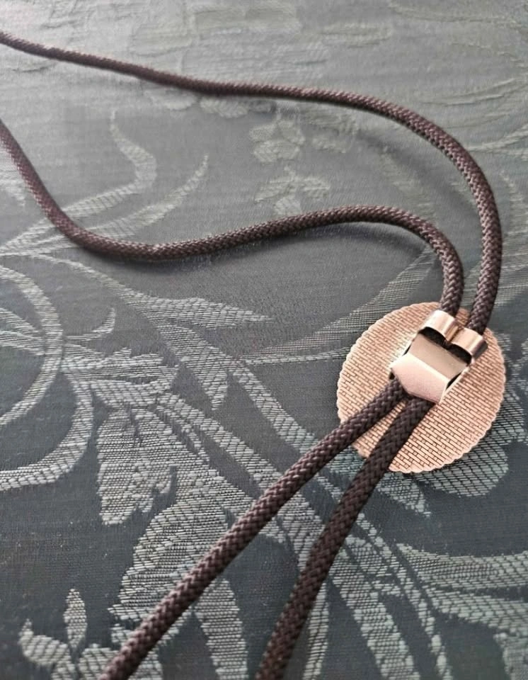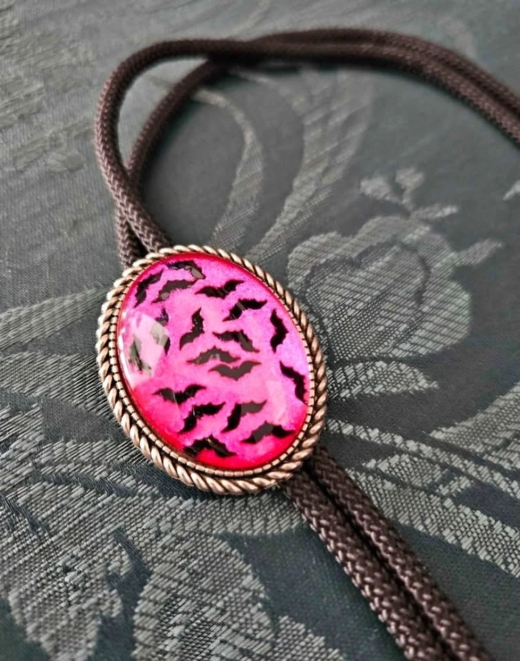 Cute handmade bolo tie with a sparkly bright pink center featuring a design of black bats. Brand new, never worn.