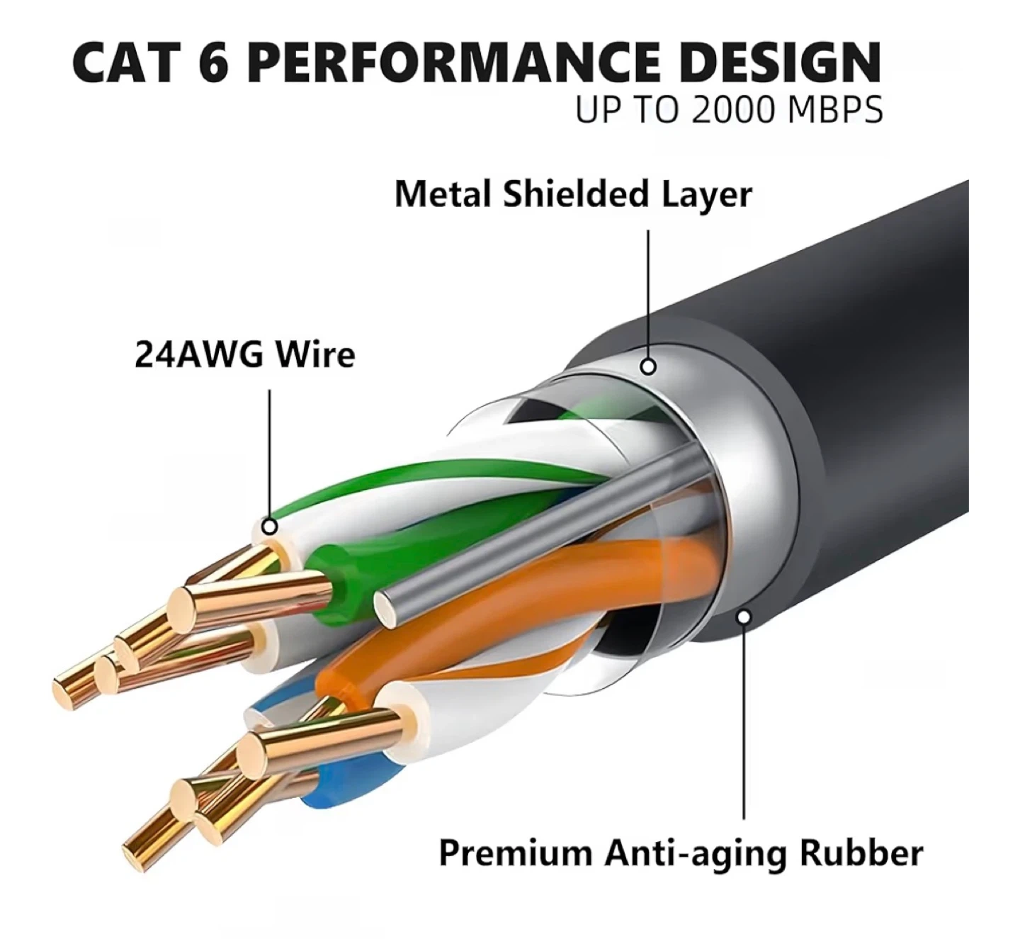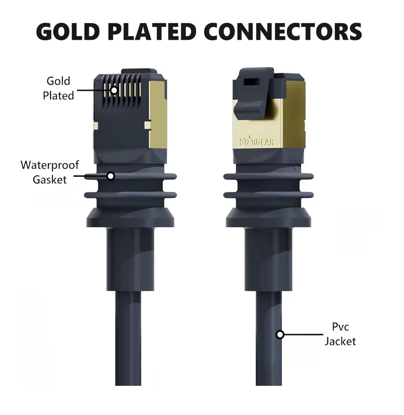 This is a ProEcoLink Starlink Gen 3 cable, measuring 49.2 feet or 15 meters. It's a Cat 6 Ethernet extension cable with gold-plated connectors and a waterproof gasket. It supports speeds up to 2000 Mbps, making it suitable for reliable network connections. This cable is plug and play for easy setup.
