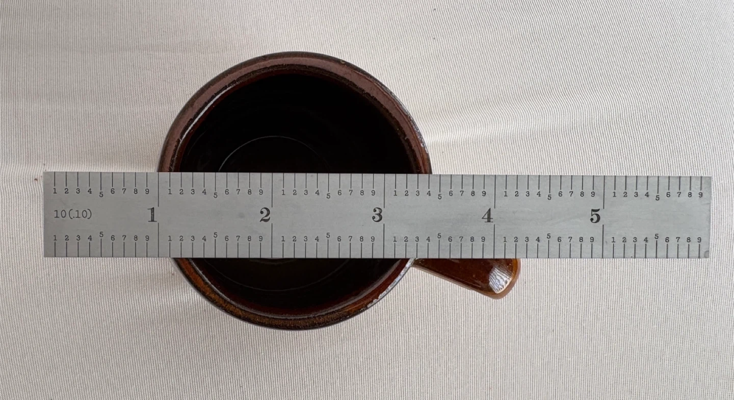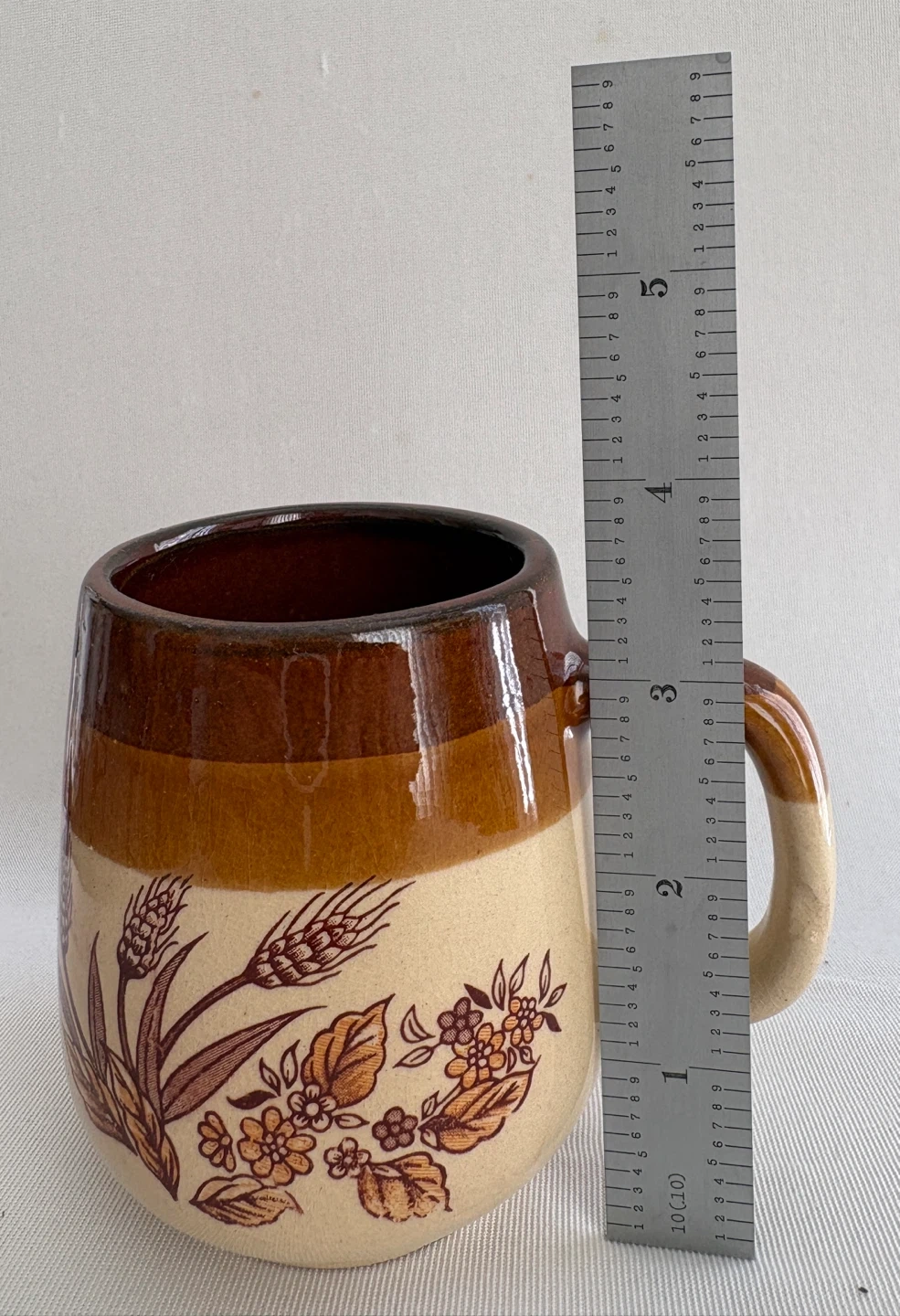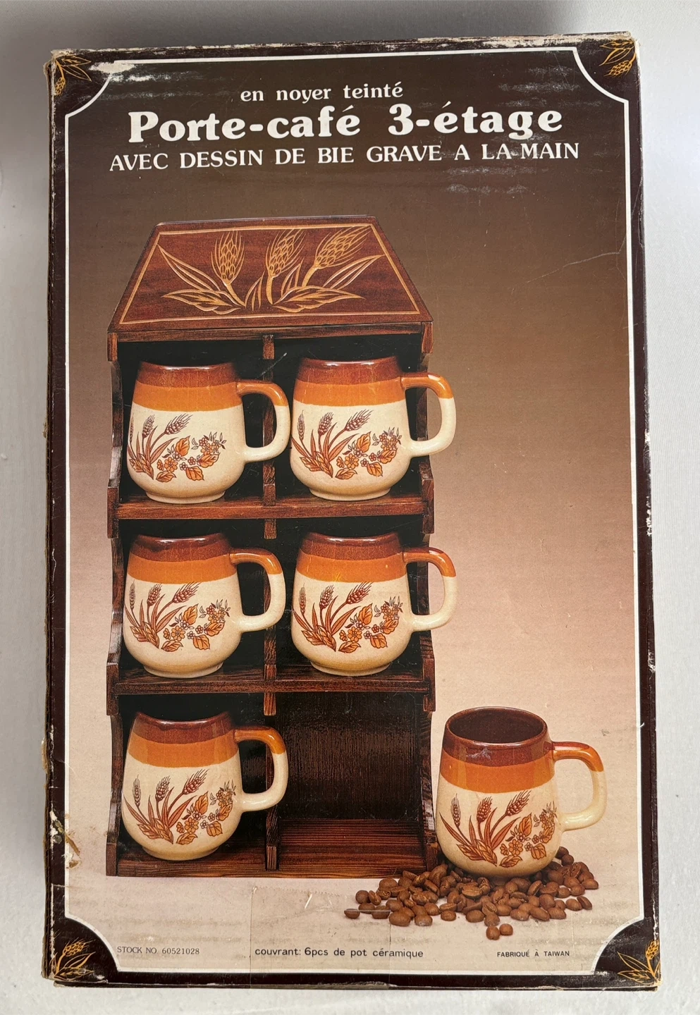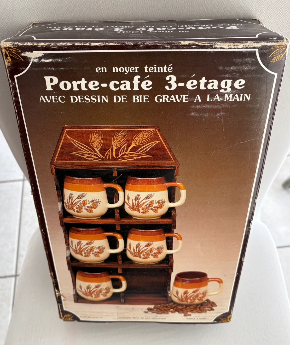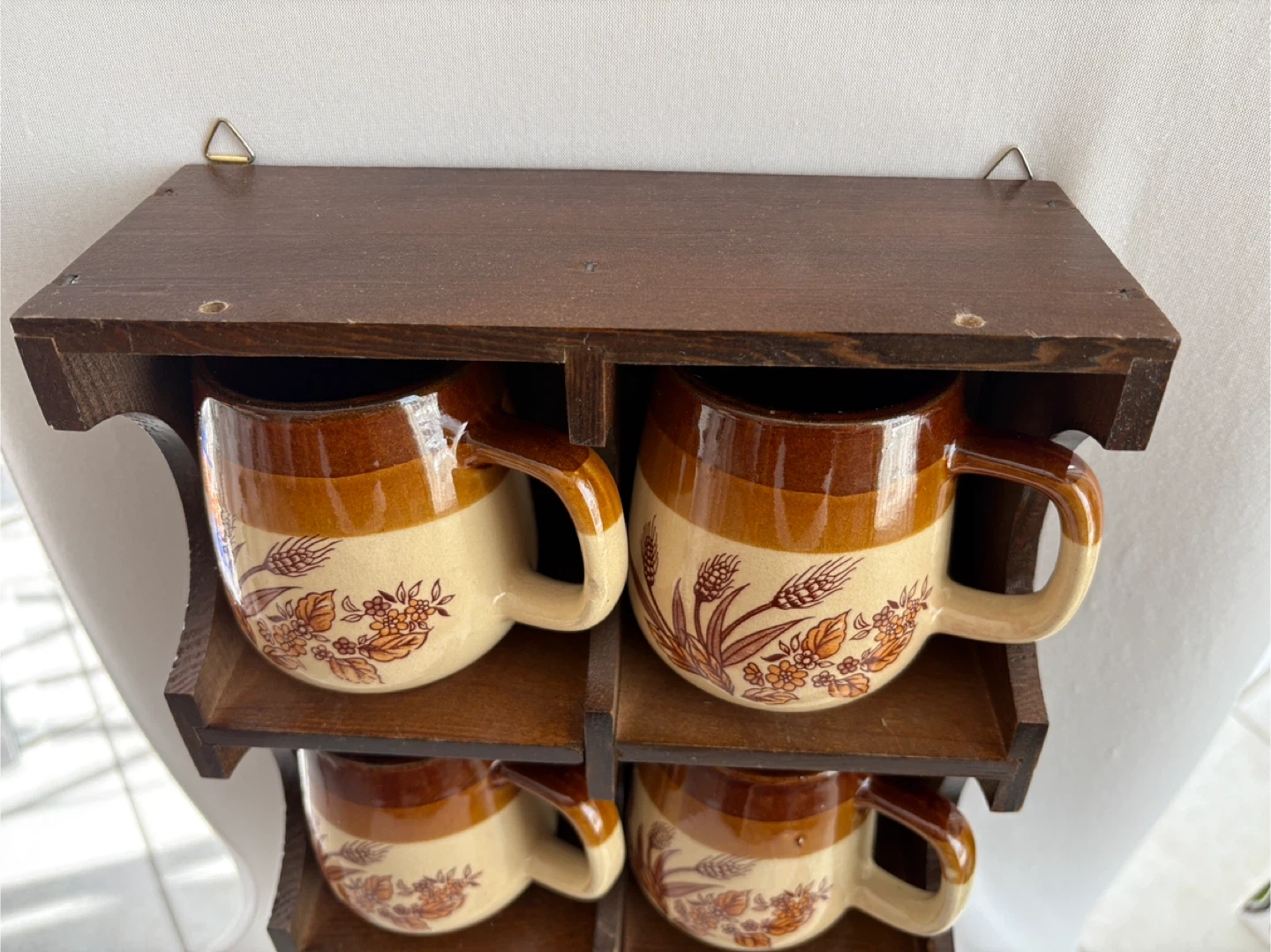 Set of 6 ceramic mugs with a wheat and floral design. Comes with a 3-tier wooden display shelf for storage and display. Mugs are tan, brown, and cream colored.