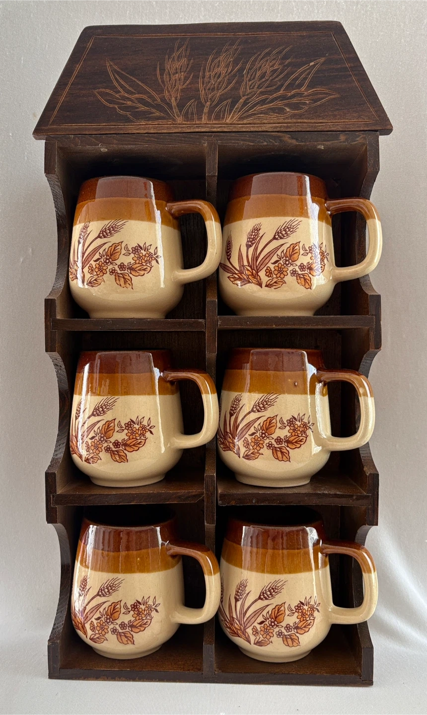 Set of 6 ceramic mugs with a wheat and floral design. Comes with a 3-tier wooden display shelf for storage and display. Mugs are tan, brown, and cream colored.
