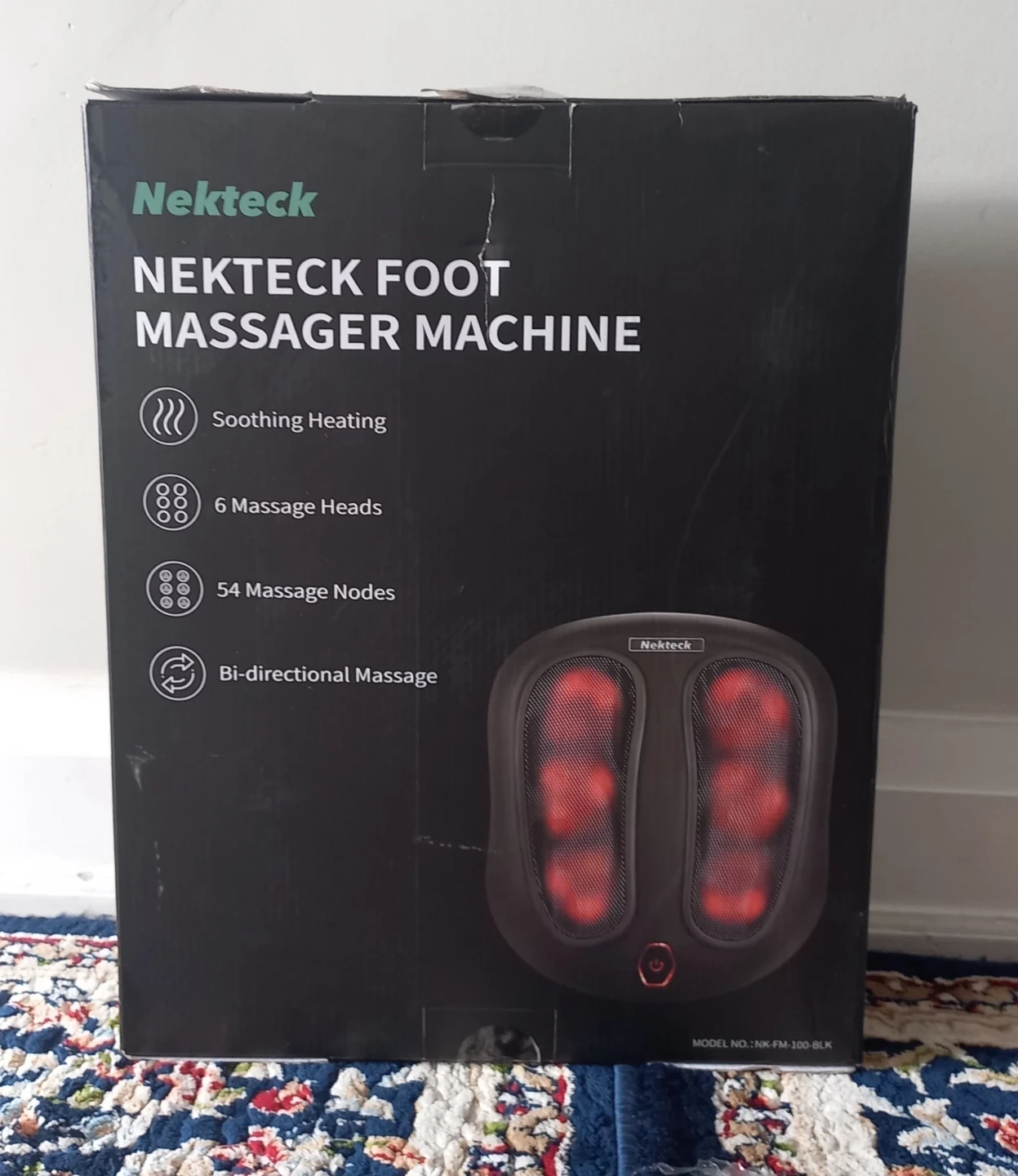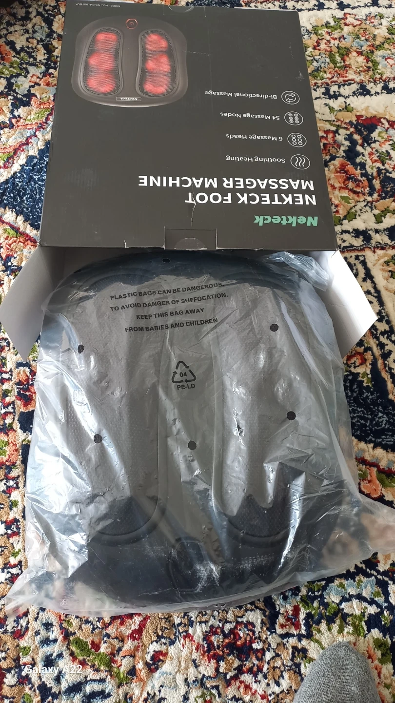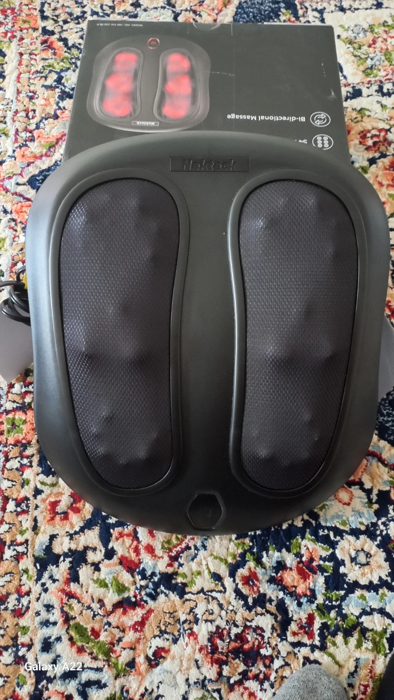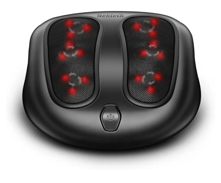 Nekteck foot massager machine with soothing heating and 54 massage nodes. It offers multi-zone massage for feet and calves with bi-directional rotation. Features easy toe-touch controls and fits large feet.