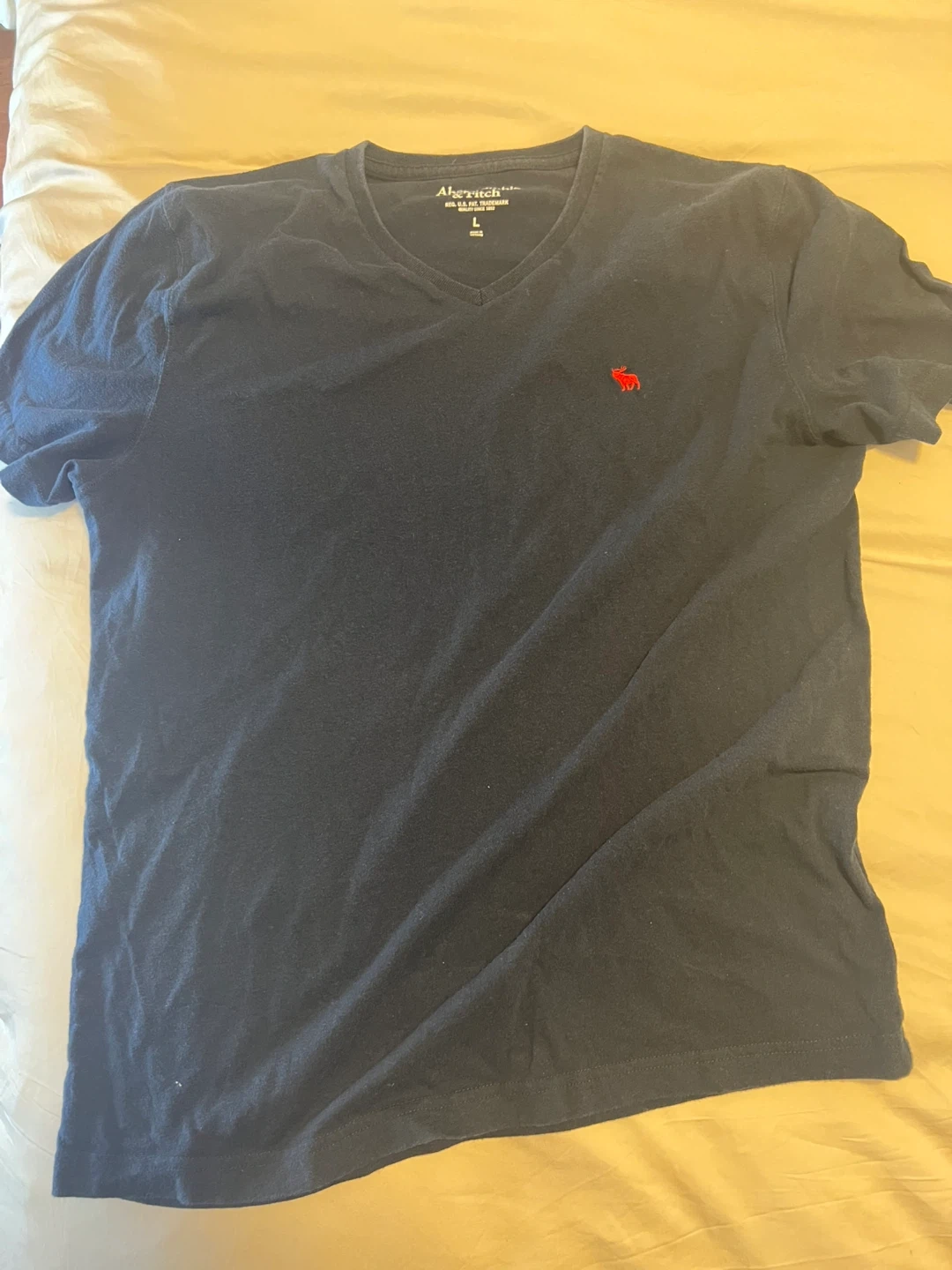 Used. This is a navy blue V-neck t-shirt from Abercrombie & Fitch. It has a small red moose logo embroidered on the chest. Size is large.