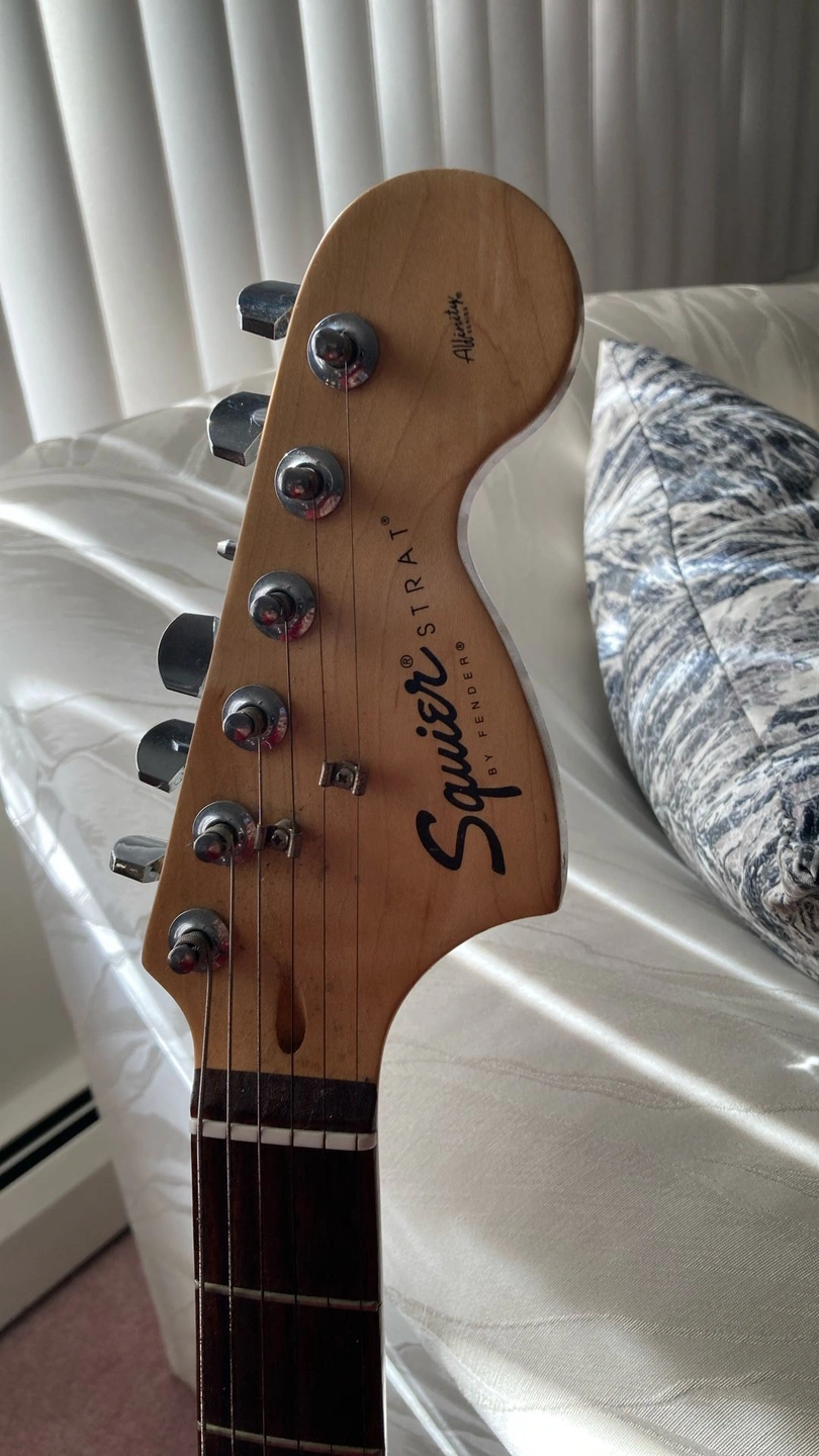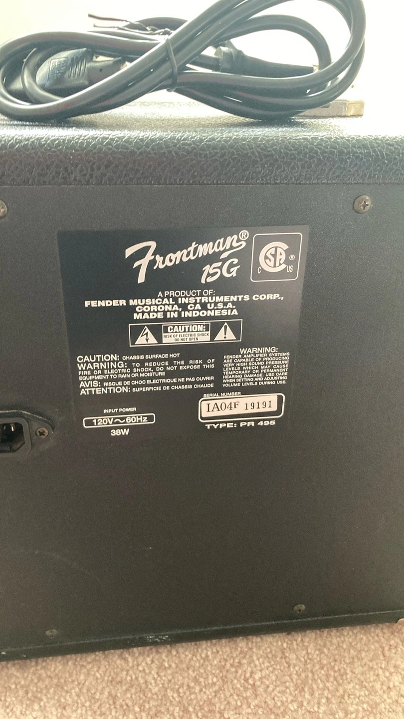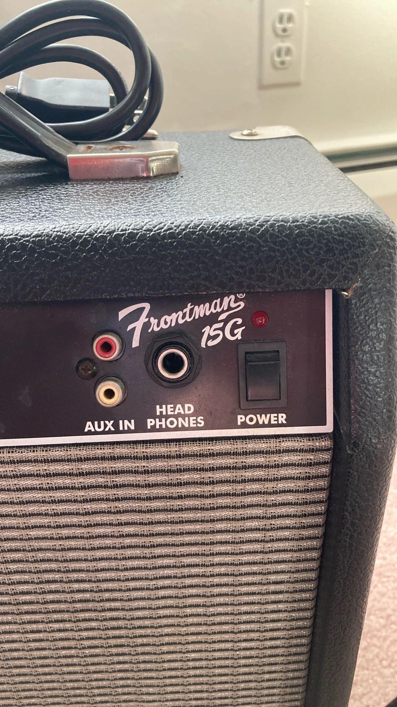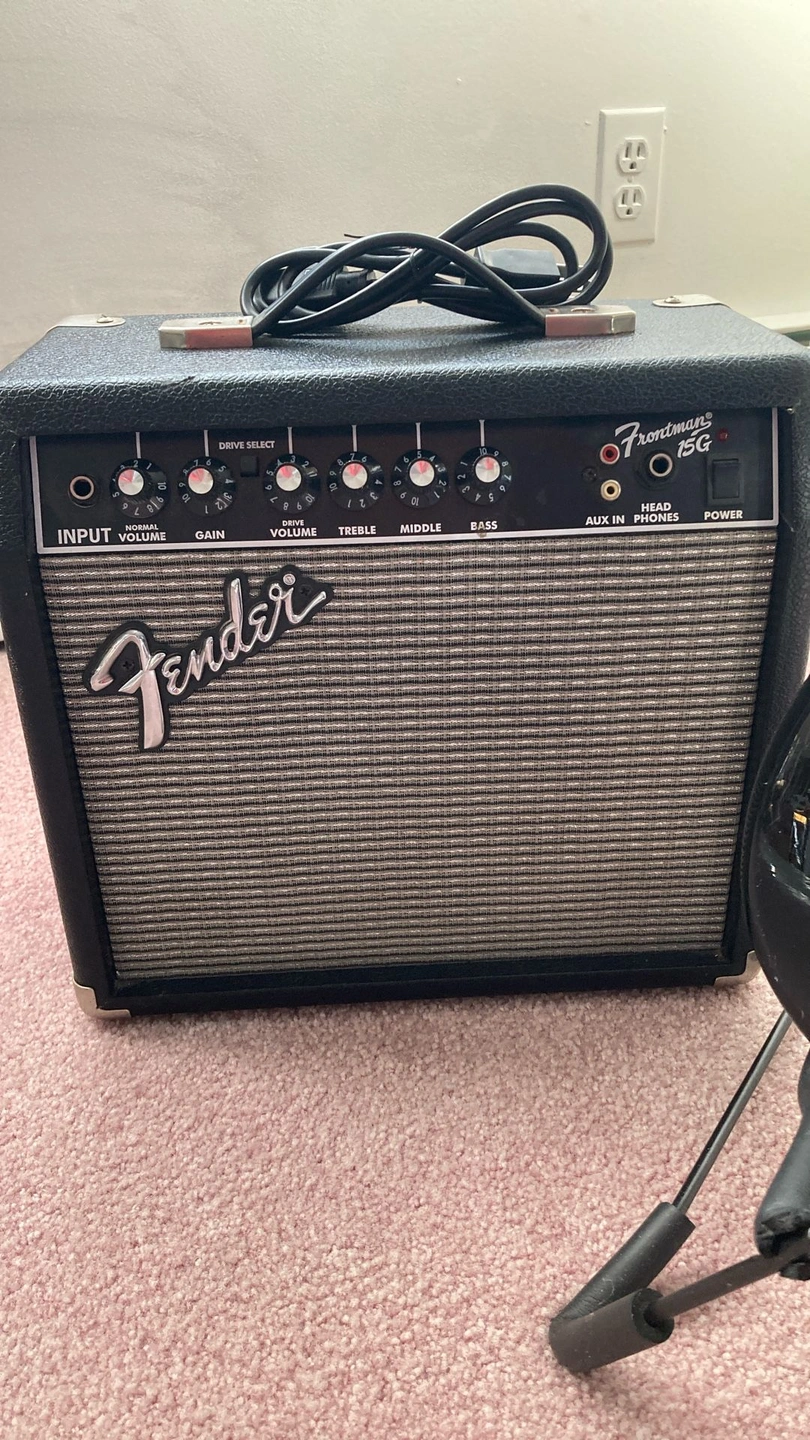 Squier Stratocaster - Black with white pickguard, rosewood fretboard. Fender Frontman 15G Features: Solid State Output, 15 watts into 8 ohms, 8" Fender Special Design Speaker, Dual Selectable Channels (Normal and Drive), 3-Band EQ, Headphone Jack, Auxiliary Input for CD, Tape, or Drum Machine, Closed Back Blackface Styling with Silver Grille Cloth, Covering: Black Textured Vinyl with Silver Grille Cloth, Weight: 15 lbs. I have several amplifiers if you're looking for something different. Body Color: Black, Size: 4/4, Right-handed, Type: Electric, Brand: Fender.