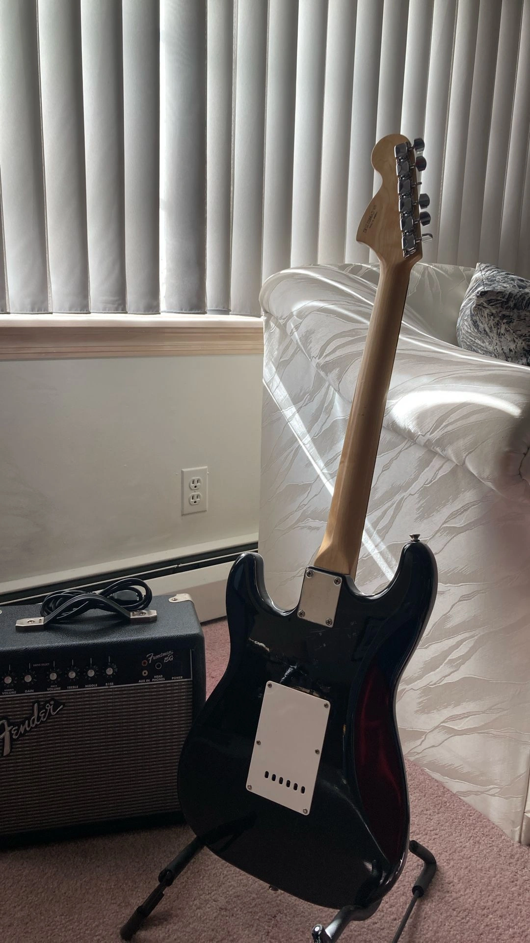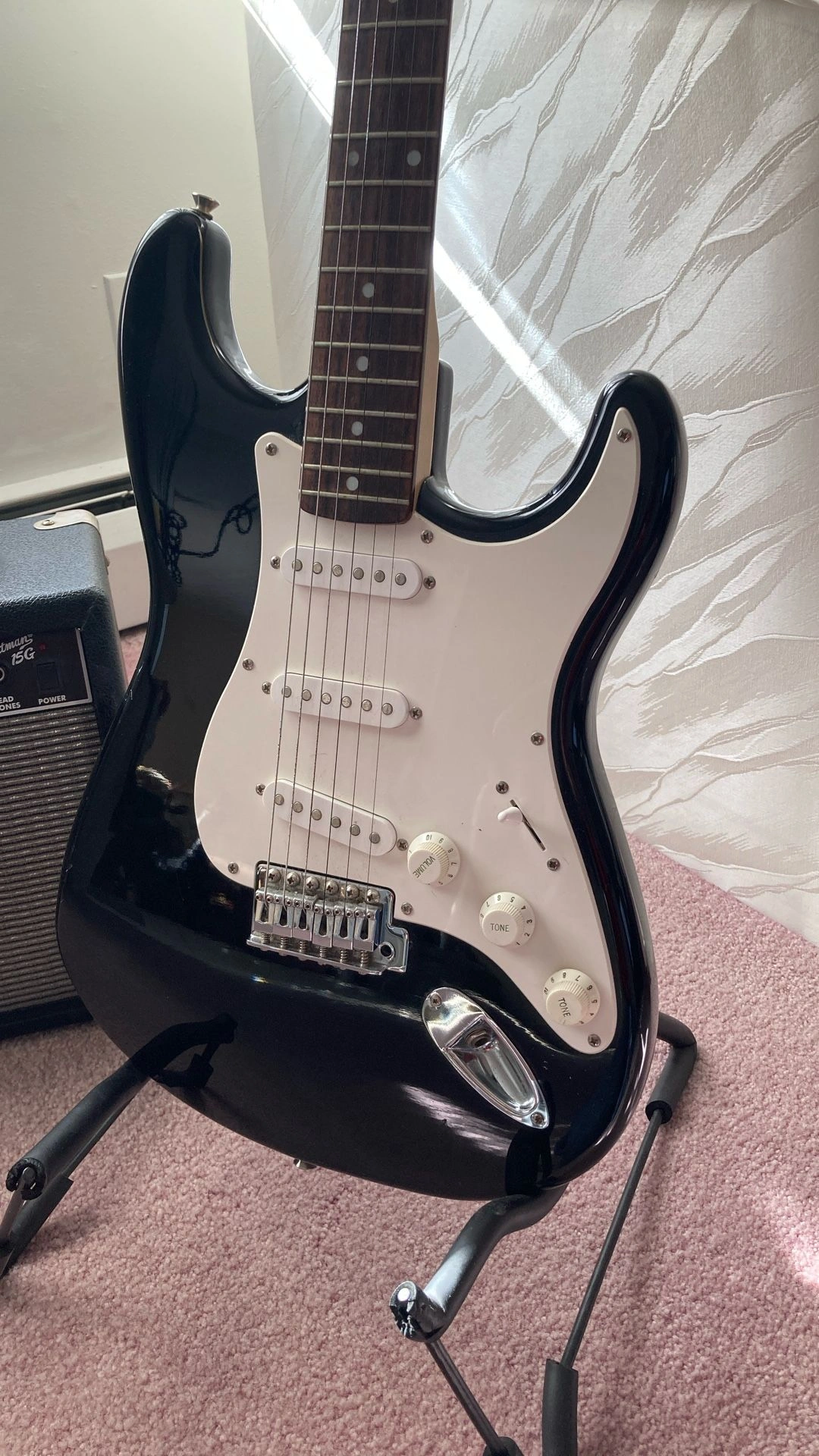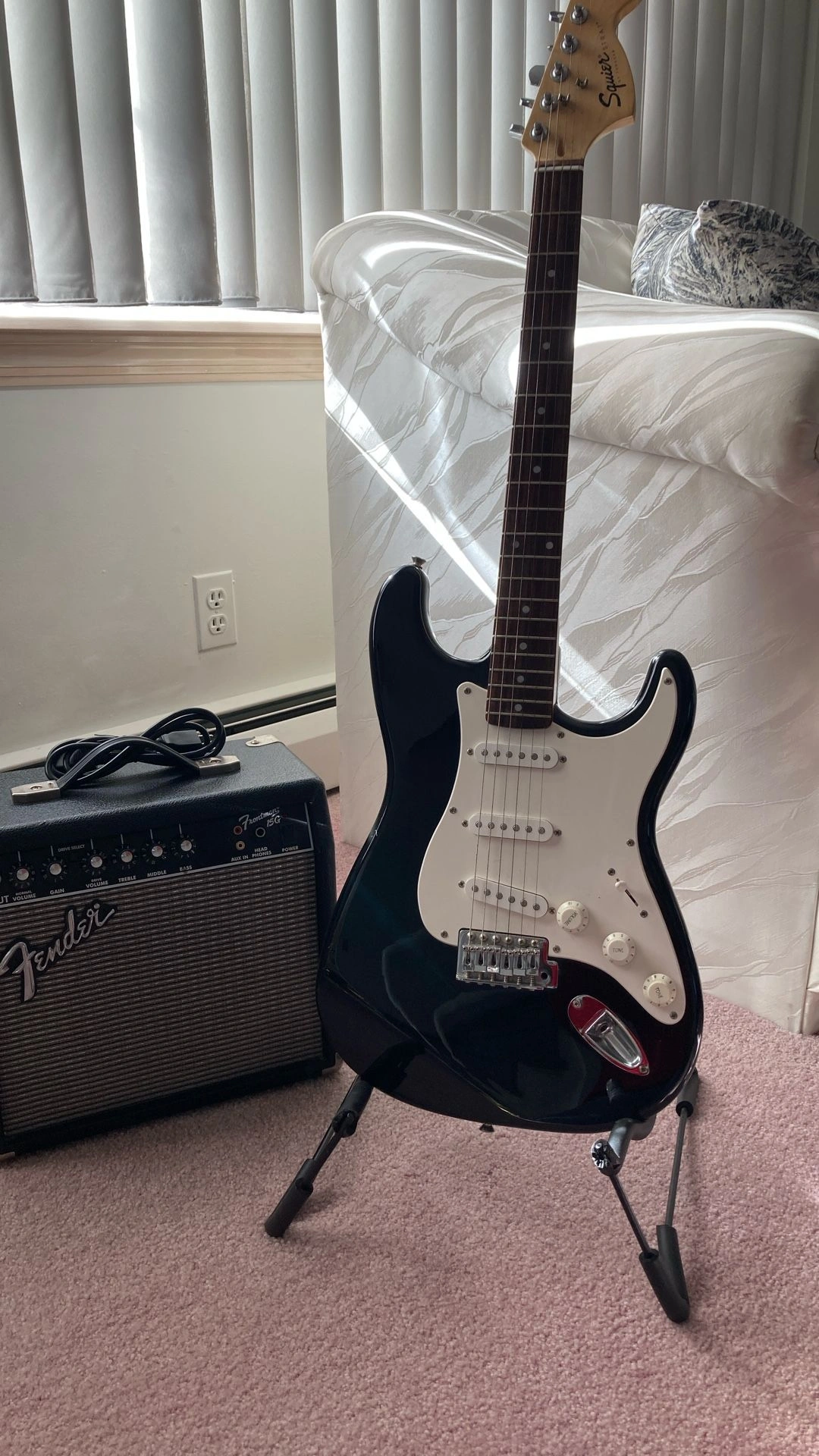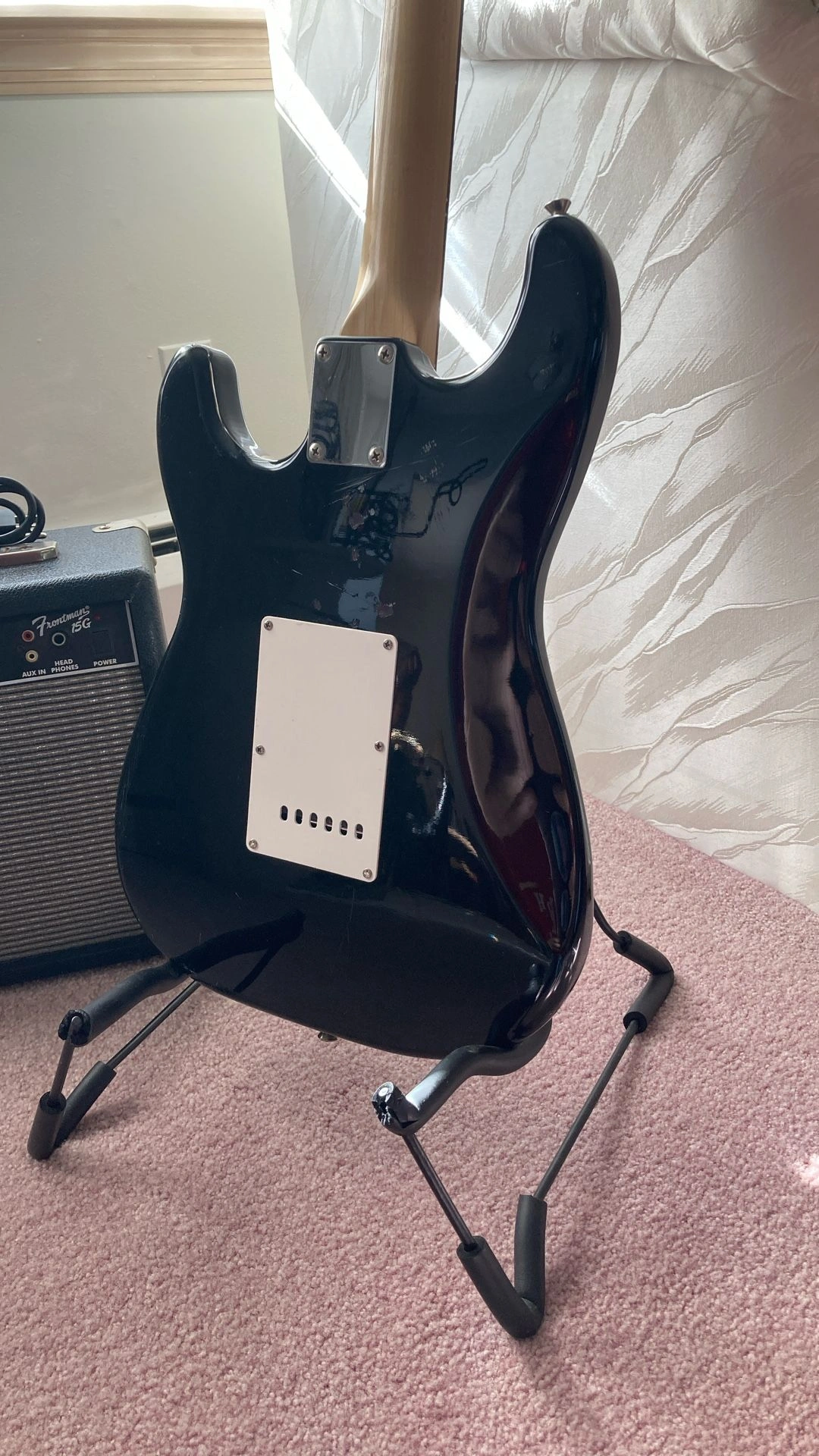Squier Stratocaster - Black with white pickguard, rosewood fretboard. Fender Frontman 15G Features: Solid State Output, 15 watts into 8 ohms, 8" Fender Special Design Speaker, Dual Selectable Channels (Normal and Drive), 3-Band EQ, Headphone Jack, Auxiliary Input for CD, Tape, or Drum Machine, Closed Back Blackface Styling with Silver Grille Cloth, Covering: Black Textured Vinyl with Silver Grille Cloth, Weight: 15 lbs. I have several amplifiers if you're looking for something different. Body Color: Black, Size: 4/4, Right-handed, Type: Electric, Brand: Fender.
