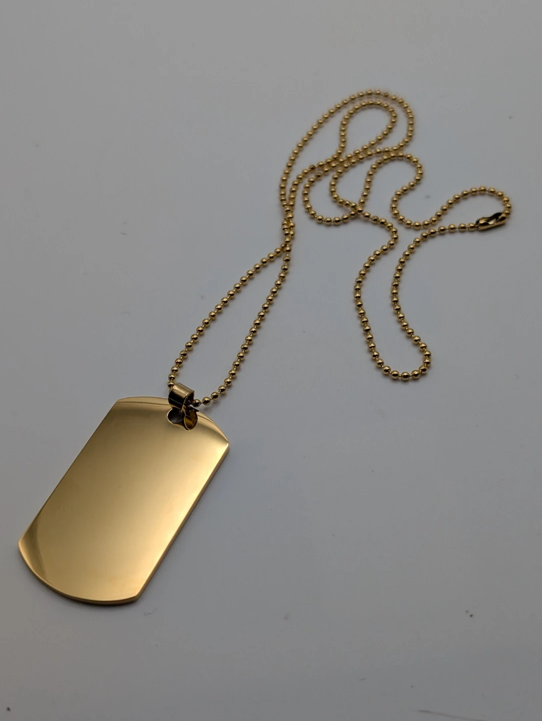 This is a gold tone dog tag necklace. It features a ball chain. It's suitable for personalization.