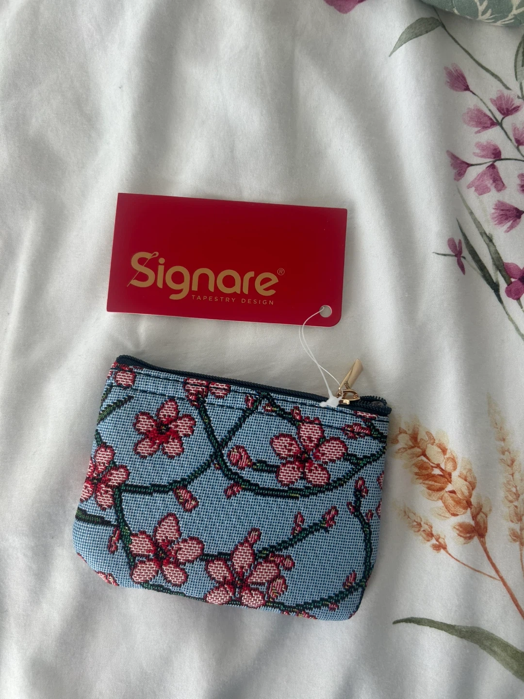 This Signare coin purse features a lovely cherry blossom tapestry design. It has a zippered closure, perfect for keeping small essentials secure. It's great for carrying change or cards.