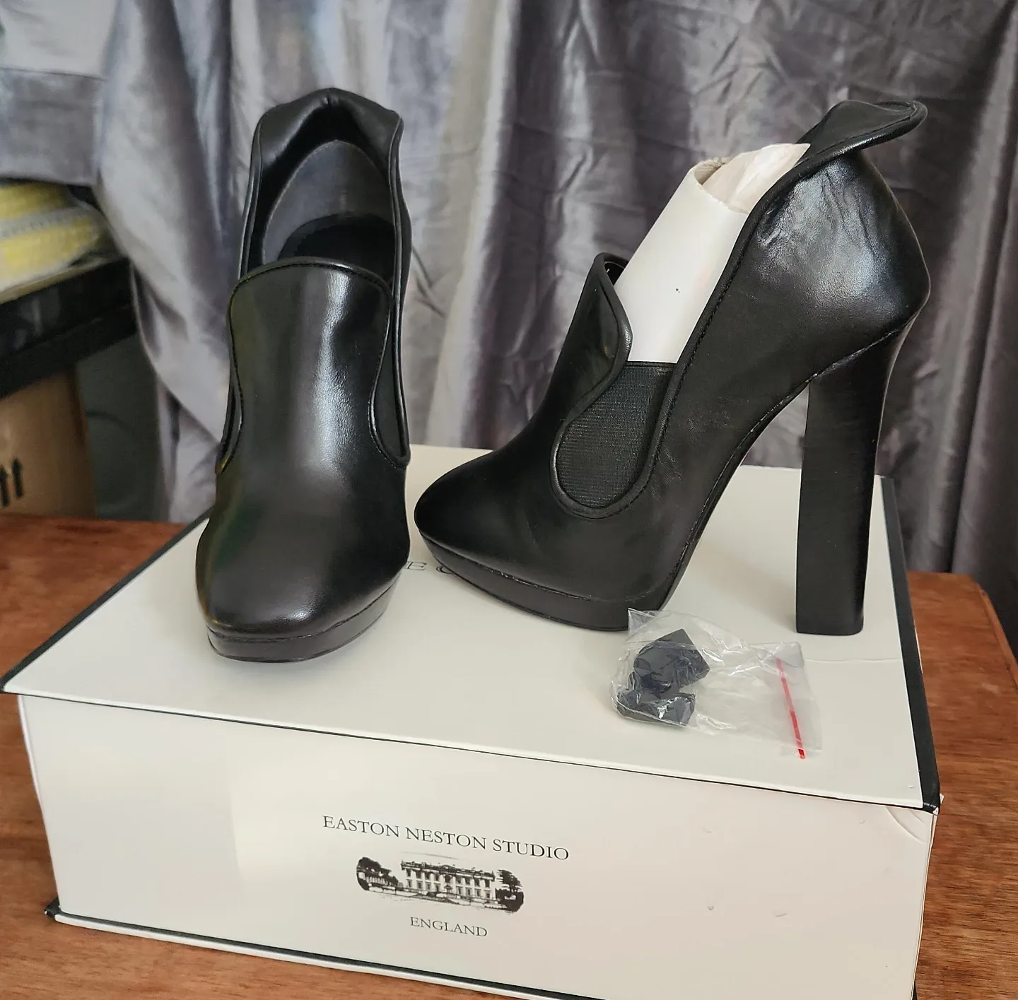 Black leather heeled boots from Easton Weston Studio. Fine leather upper, lining, and sole. Includes replacement heel tips. Vero Cuoio sole.