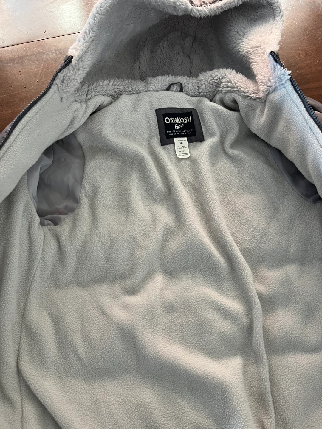 This OshKosh B'gosh puffer jacket is grey with a cozy fleece lining. It features a full zip closure and a hood. Size 12. Great for keeping warm on chilly days!