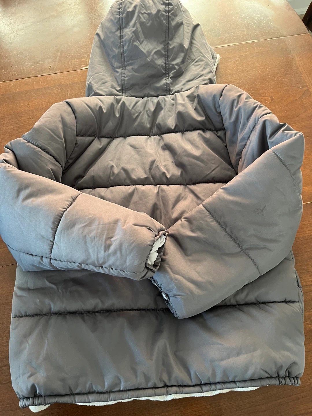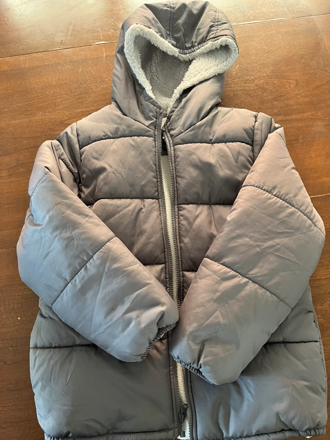This OshKosh B'gosh puffer jacket is grey with a cozy fleece lining. It features a full zip closure and a hood. Size 12. Great for keeping warm on chilly days!