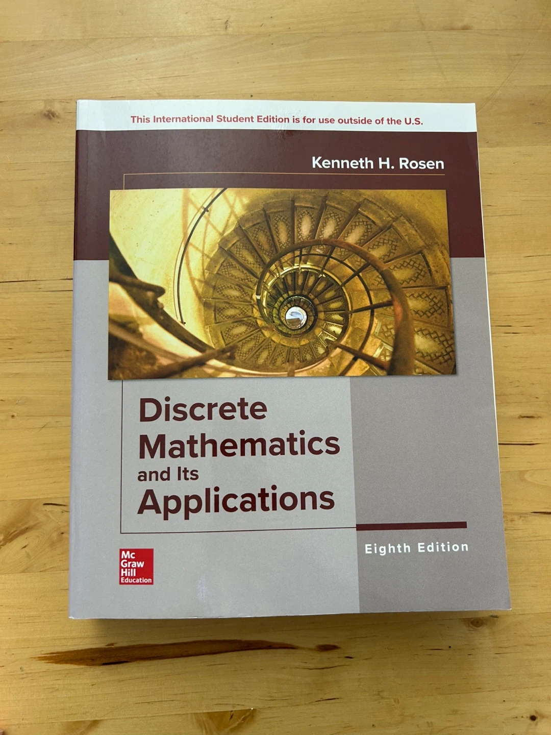 Kenneth H. Rosen's Discrete Mathematics and Its Applications, Eighth Edition textbook. This international student edition is for use outside of the U.S. It covers fundamental concepts in discrete mathematics.