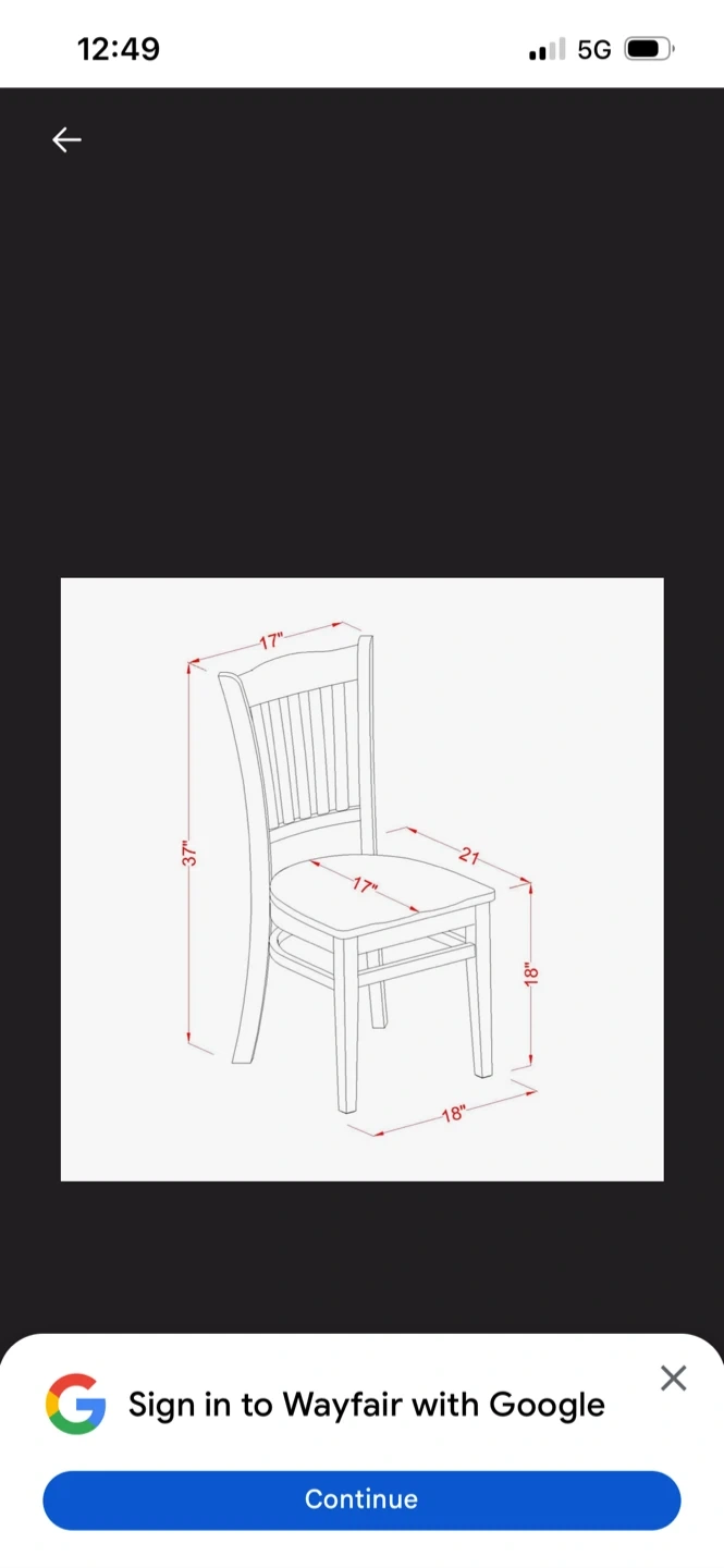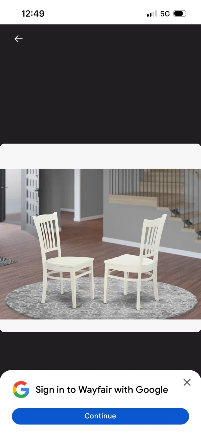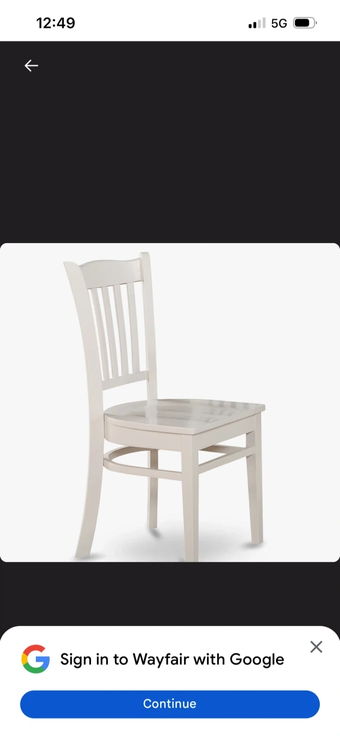 These are two white dining chairs with a slatted back design. Seat height is 16 inches. Total chair height is 37 inches. They're made of wood.