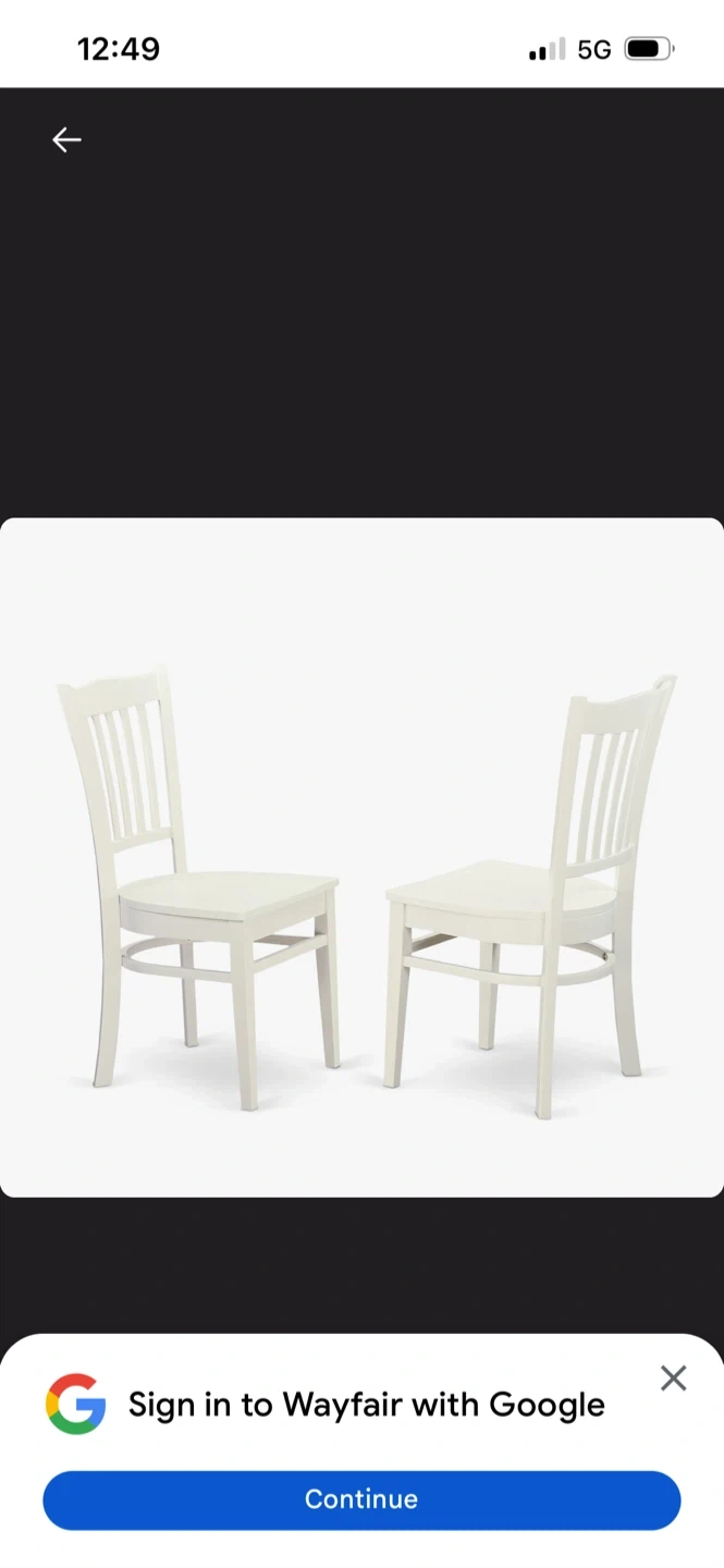 These are two white dining chairs with a slatted back design. Seat height is 16 inches. Total chair height is 37 inches. They're made of wood.
