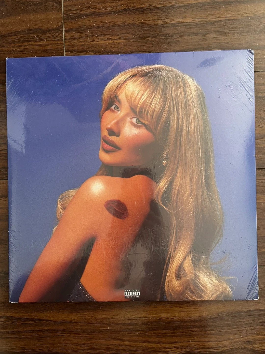 This is the "Sweetener" vinyl record. It's still sealed in its original plastic wrap. The album features a Parental Advisory label. Artist Sabrina Carpenter.
