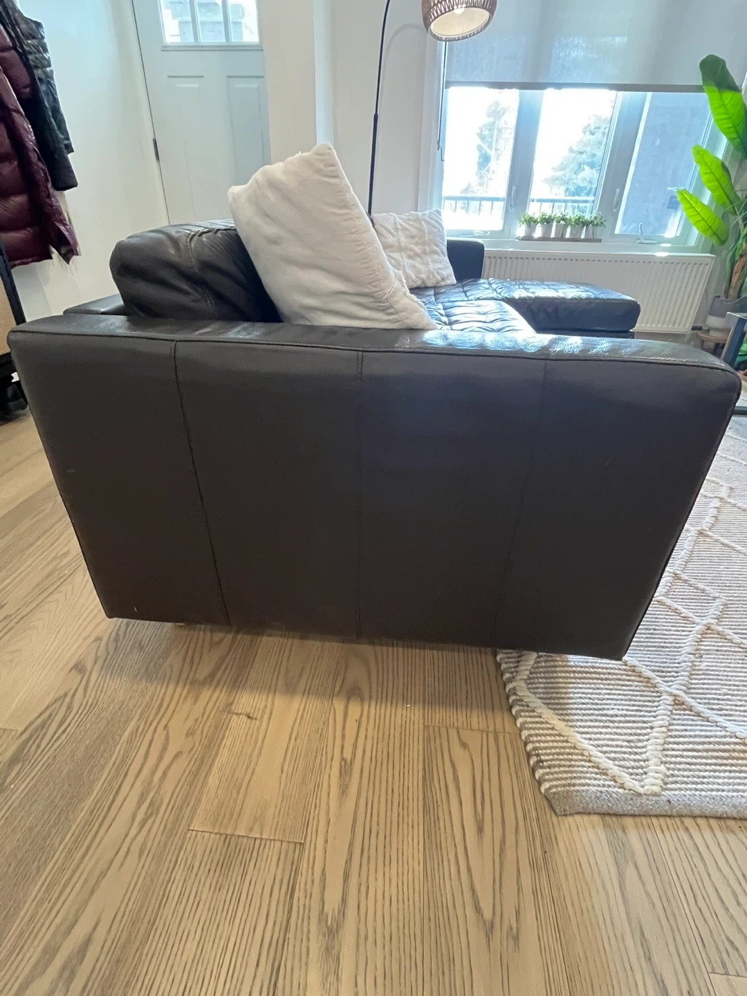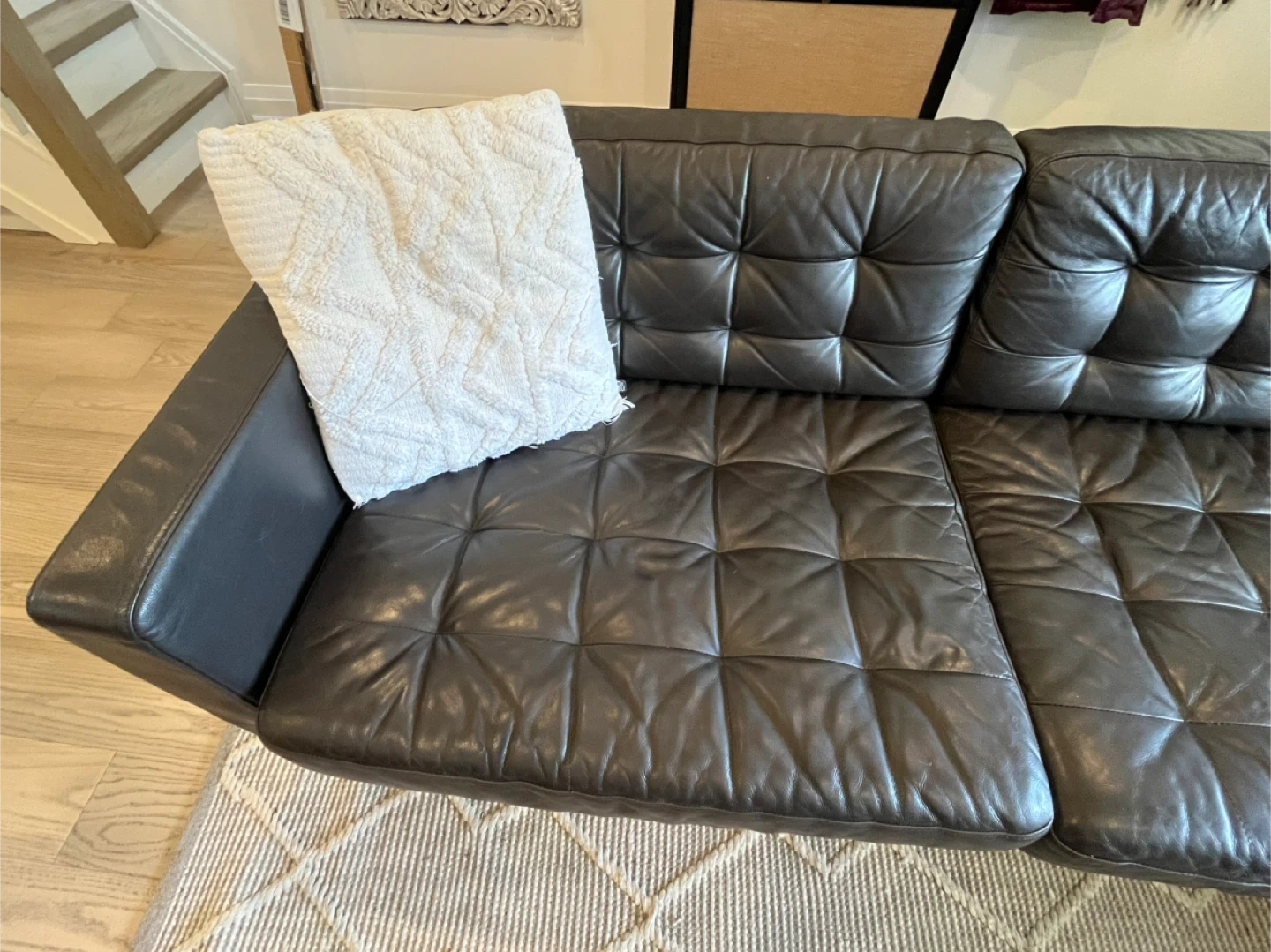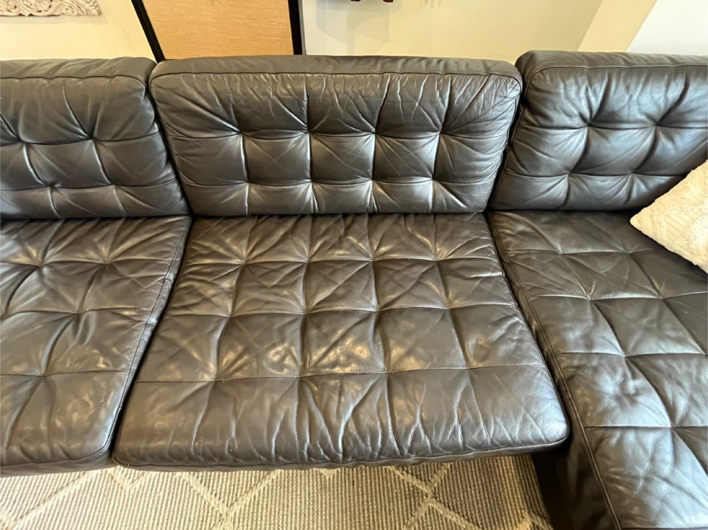 Have had it for a few years but well cared for. There are a couple marks on the cushions, chaise cushion is a little compressed but overall in solid shape and has many wood legs.
