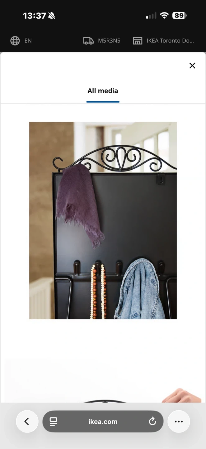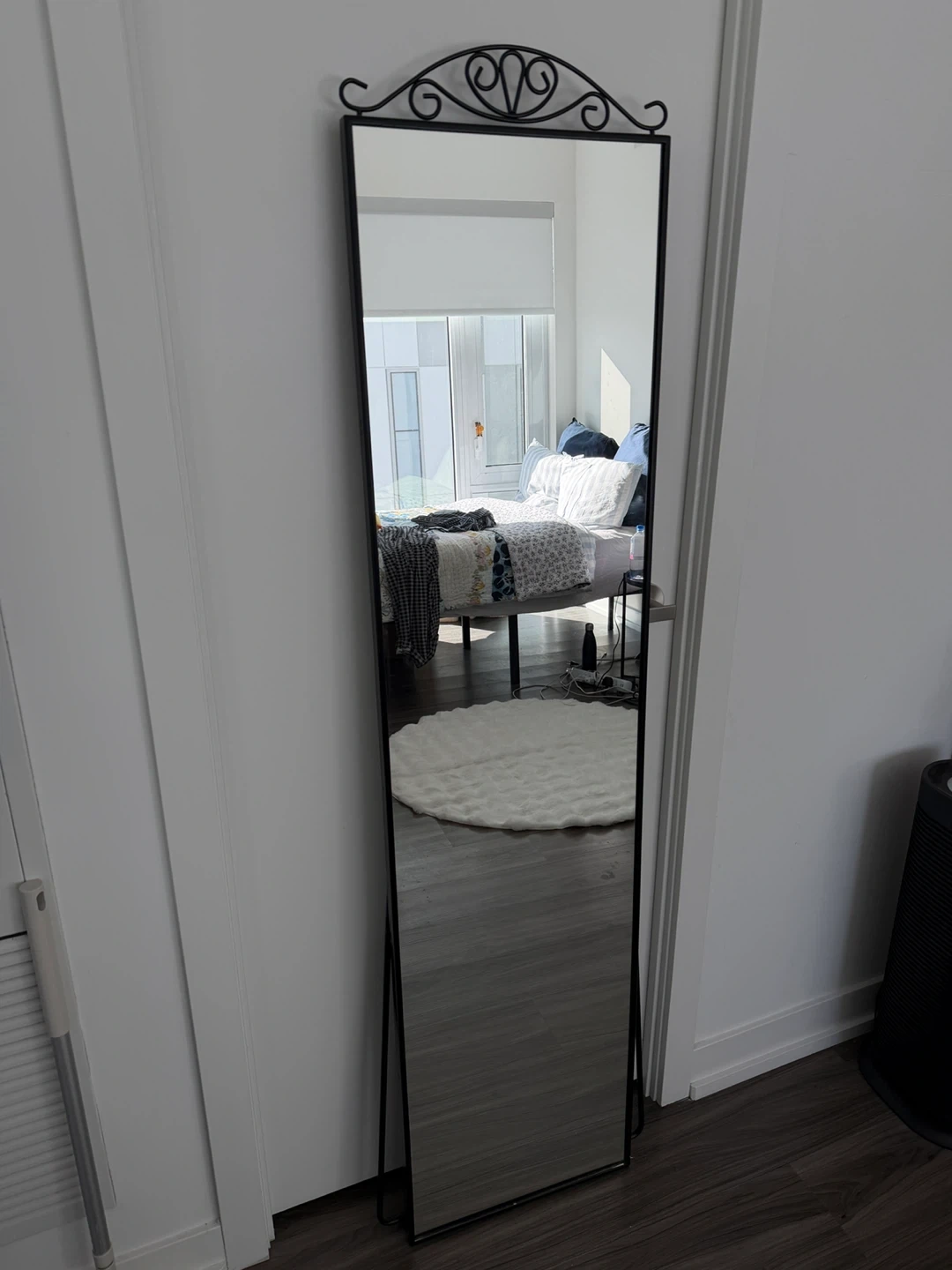 This IKEA full-length mirror features an elegant decorative scrollwork top, perfect for adding a touch of style to any room. Its freestanding design makes it easy to place and move. It's a great addition for checking outfits or enhancing the spaciousness of your living area.
