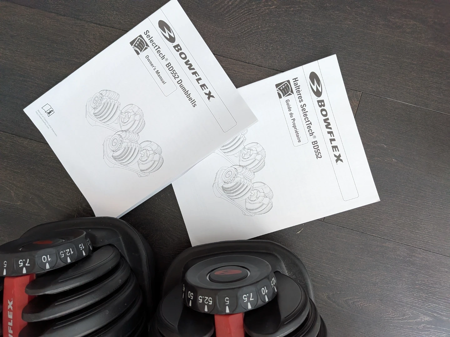 These Bowflex SelectTech 552 dumbbells adjust from 5 to 52.5 lbs. They're designed for quick weight changes. Adjustments are made with a dial.