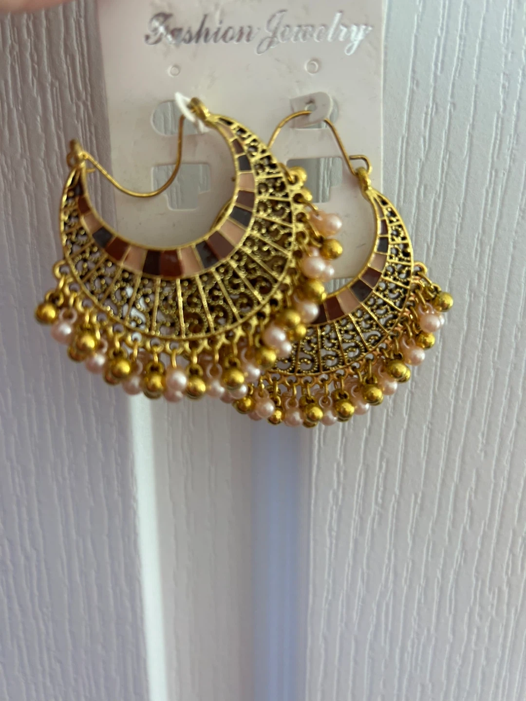 These stylish hoop earrings feature a gold-tone metal design with intricate detailing. They're adorned with small faux pearls and dangling gold beads. These earrings add a touch of elegance to any outfit!