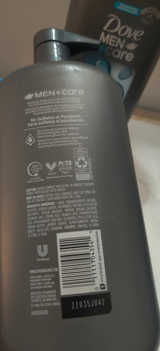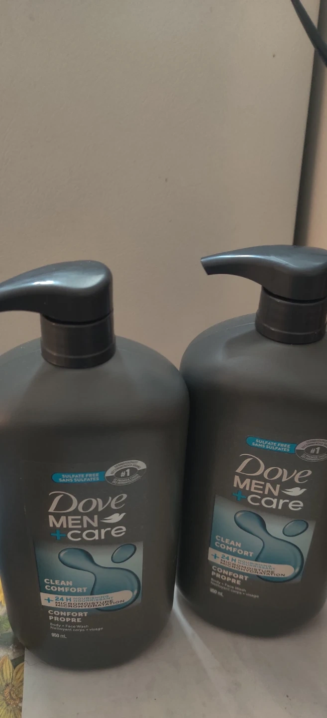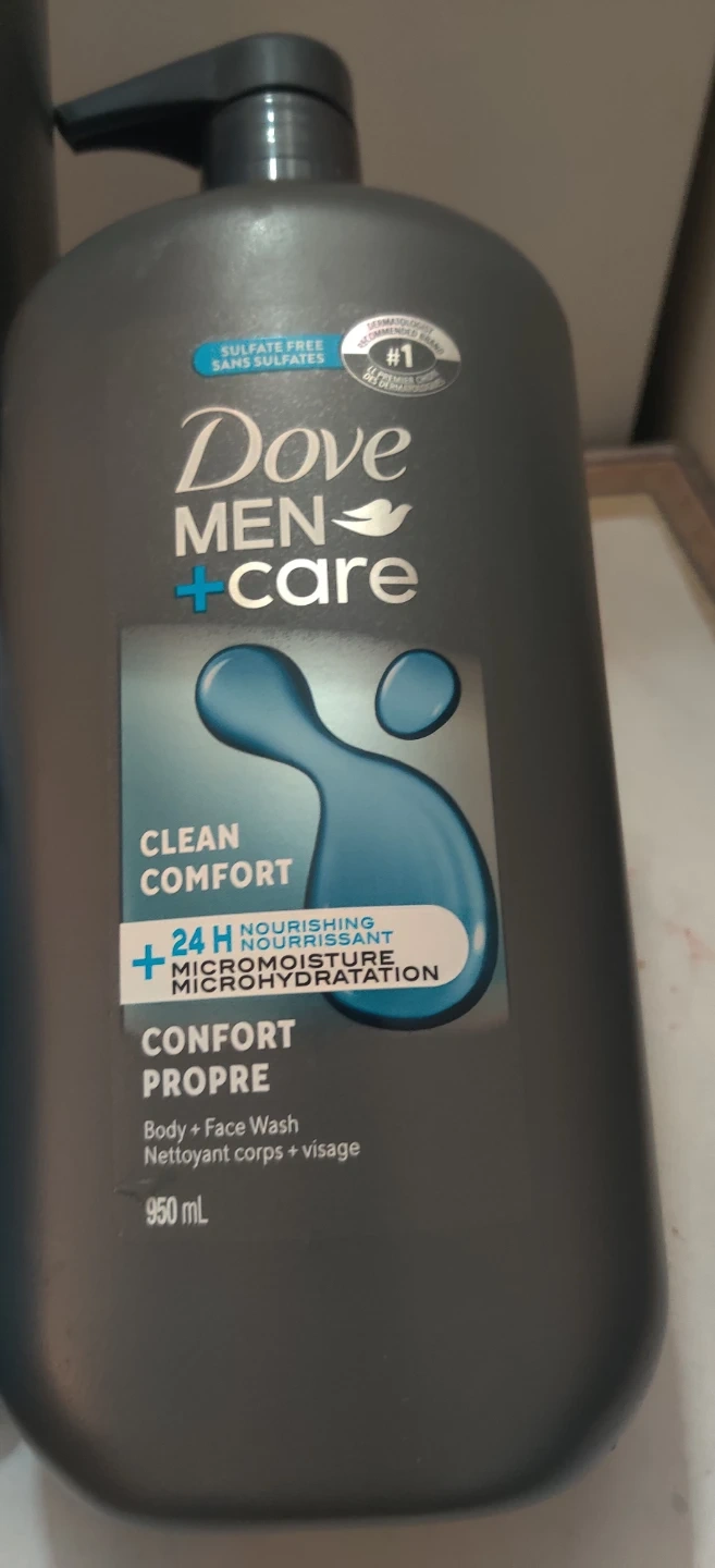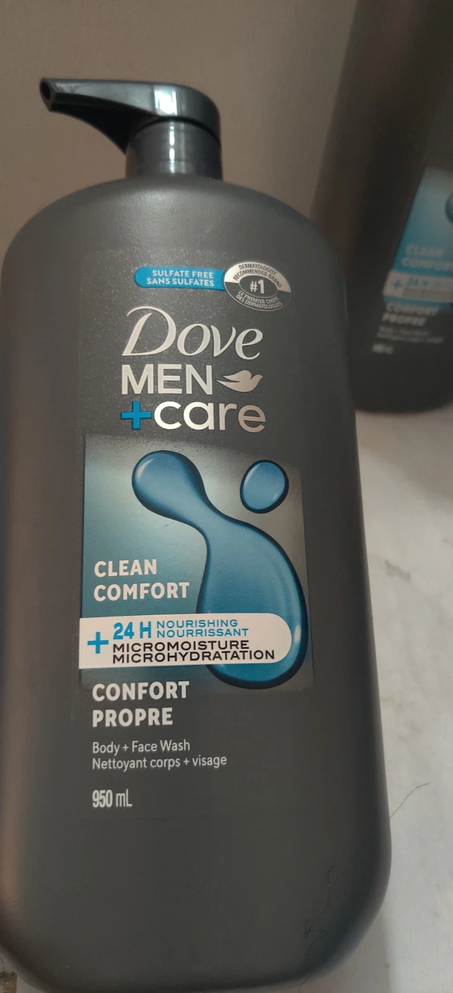 2 Dove Men + Care body and face wash comes in a large 950 mL bottle. It's formulated for clean comfort and 24-hour nourishment with Micromoisture. This wash is sulfate-free and paraben-free.