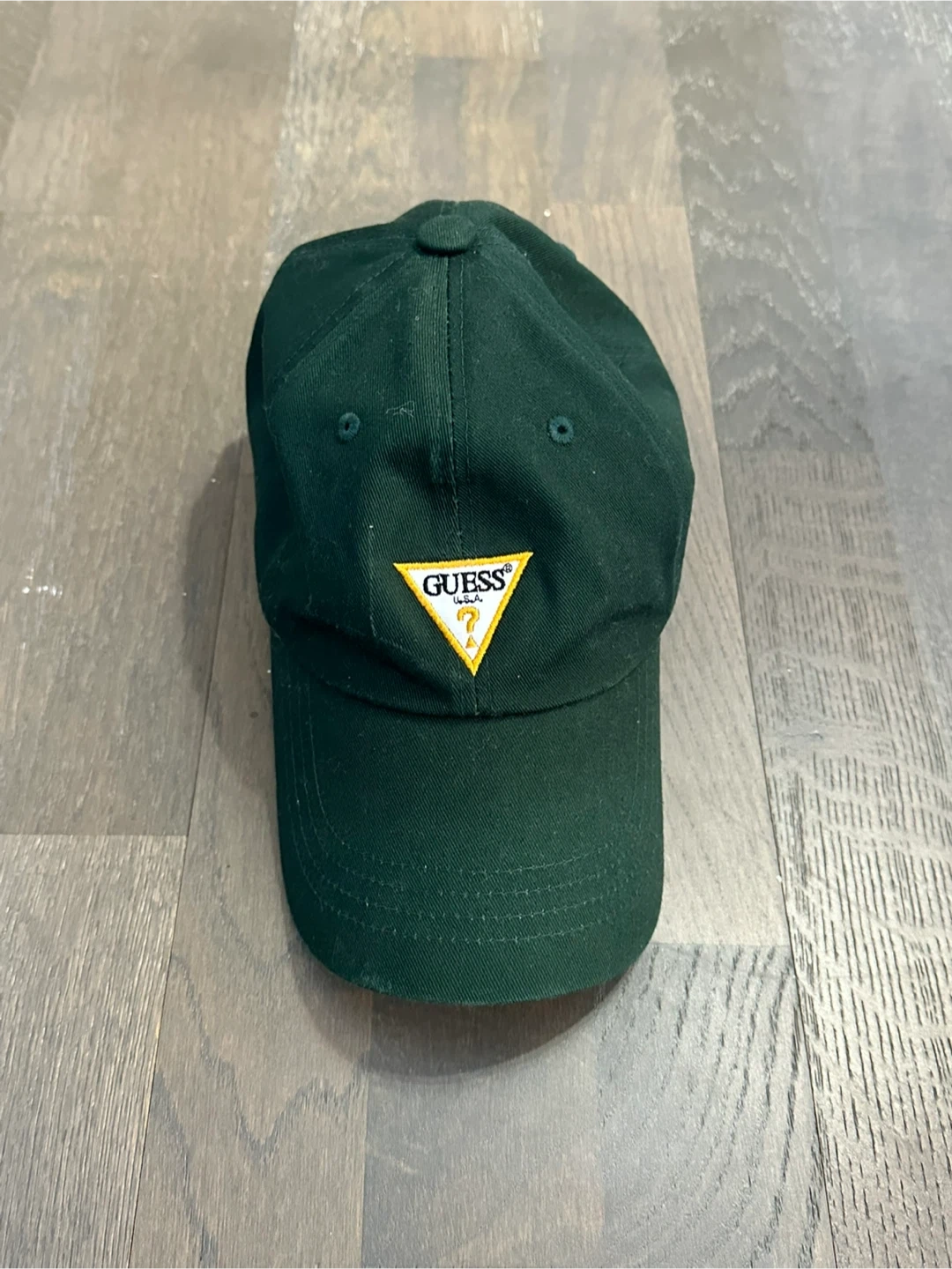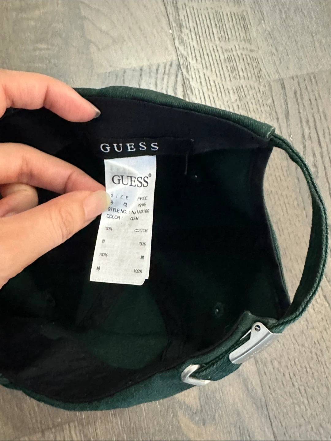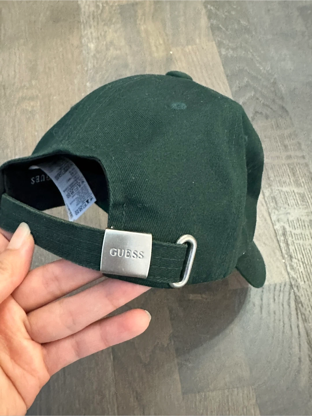 Green Guess baseball cap made from 100% cotton. It features an adjustable strap with a metal buckle. This cap is one size fits all. Made in Korea 🇰🇷