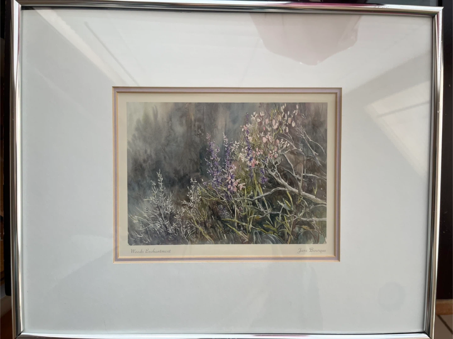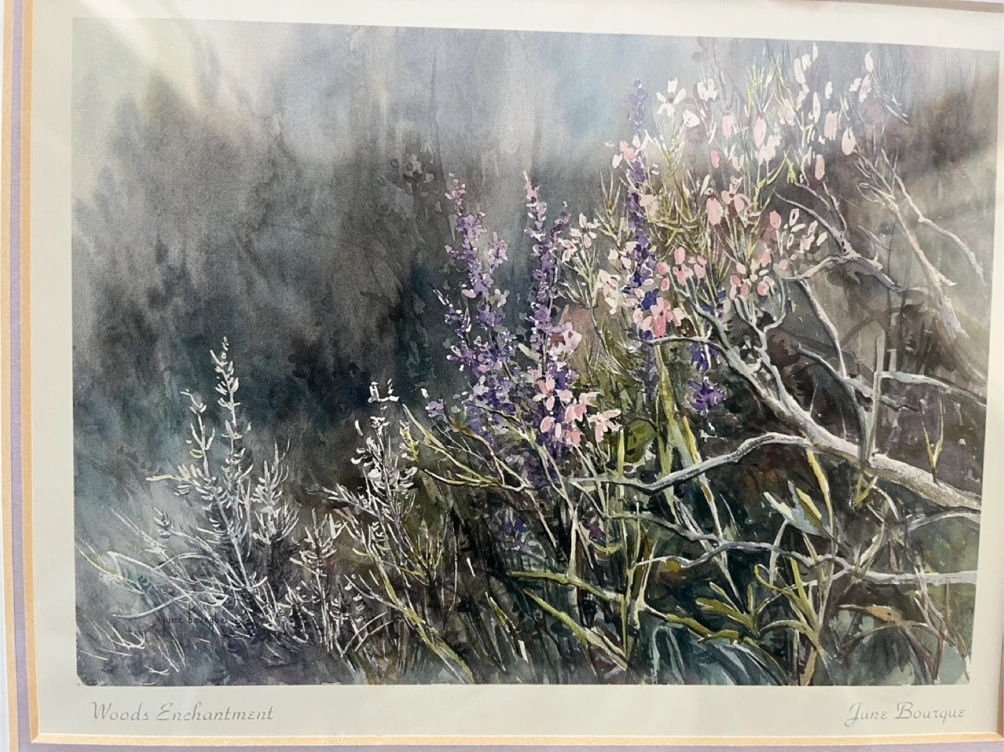 This is a vintage framed art print from 1983 titled 'Woods Enchantment' by the late artist Vivia June Bourque. It depicts a watercolour scene of wildflowers and branches.
