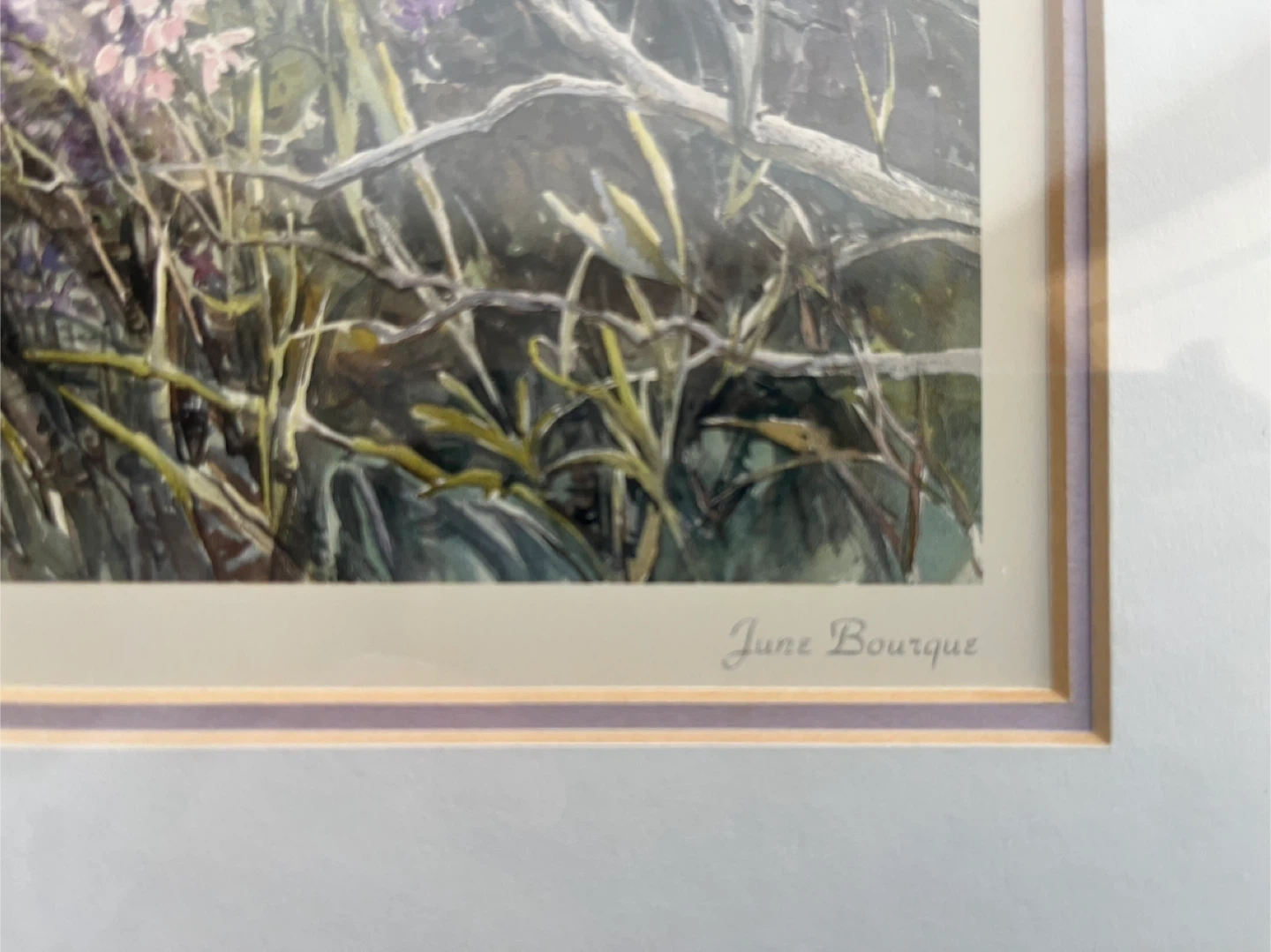 This is a vintage framed art print from 1983 titled 'Woods Enchantment' by the late artist Vivia June Bourque. It depicts a watercolour scene of wildflowers and branches.