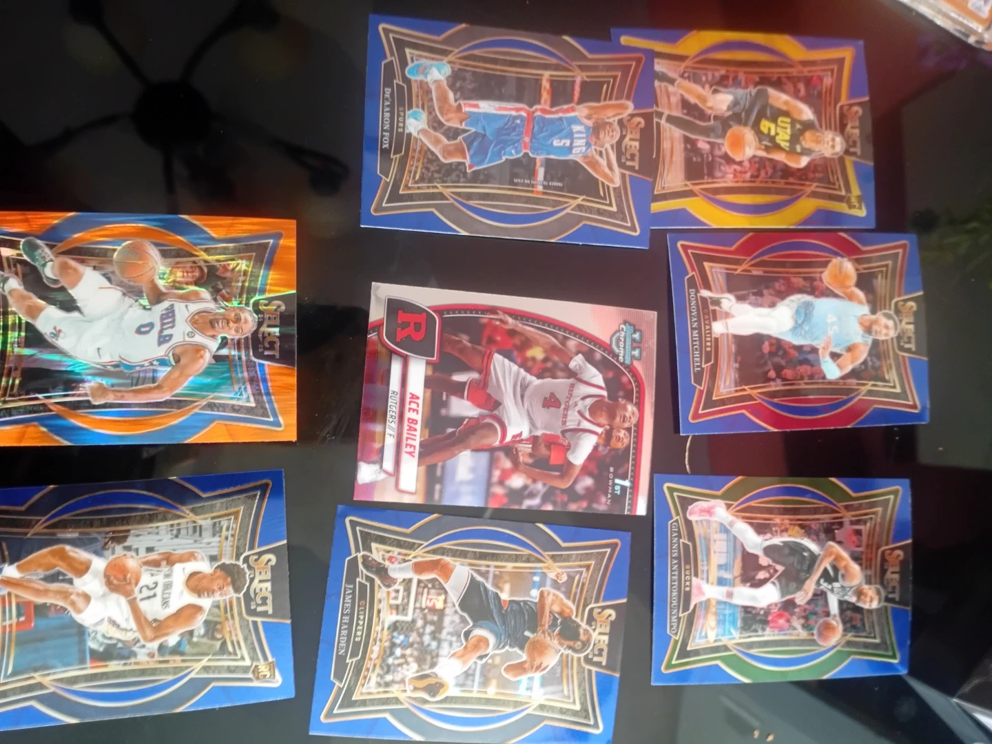 Collection of Panini Select basketball trading cards. Features players like De'Aaron Fox, Donovan Mitchell, and Giannis Antetokounmpo. Includes a variety of designs and colours. Great for any basketball card collector!