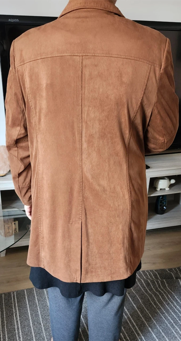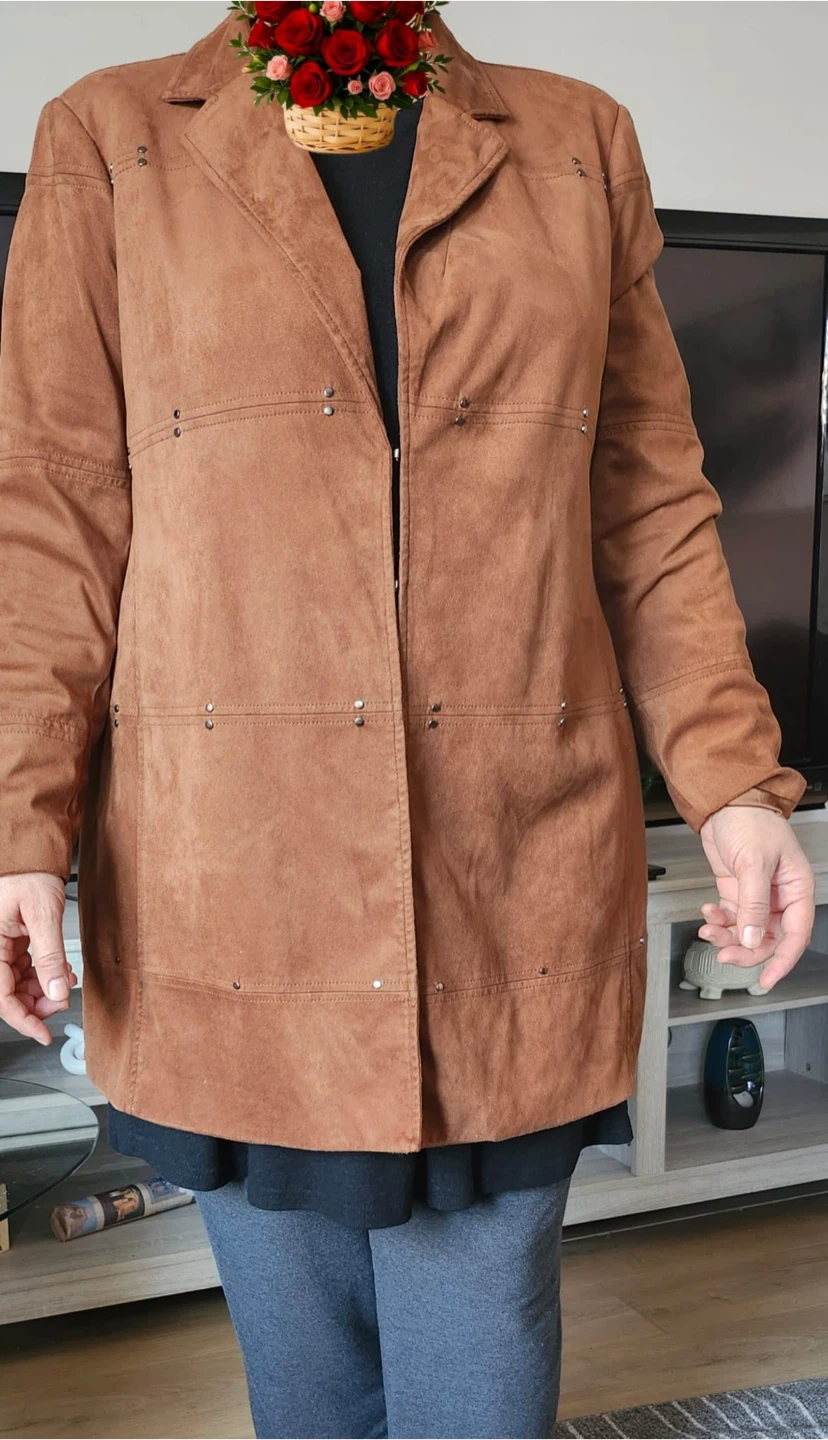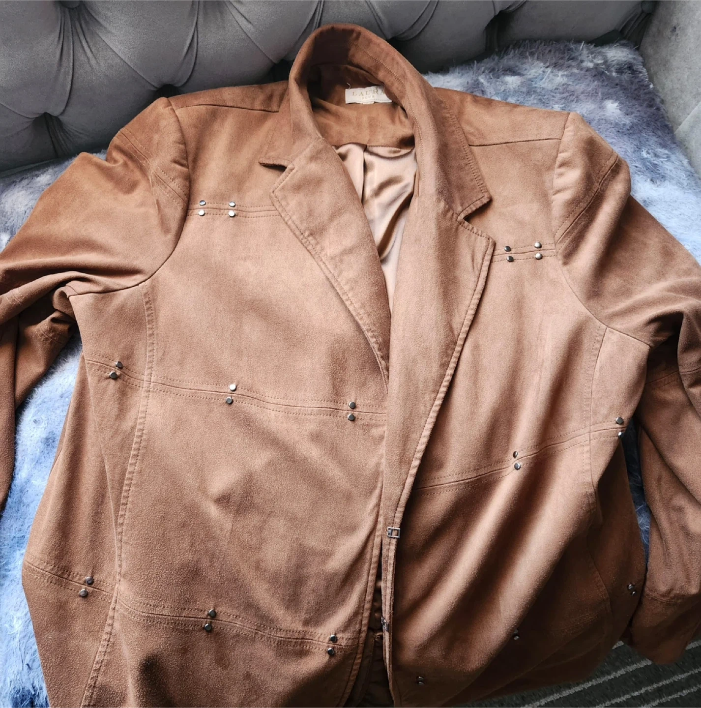 Nice brown blazer from Ralph Lauren. It's made of a soft, suede-like material and has decorative stud accents. The lining is a silky satin fabric.