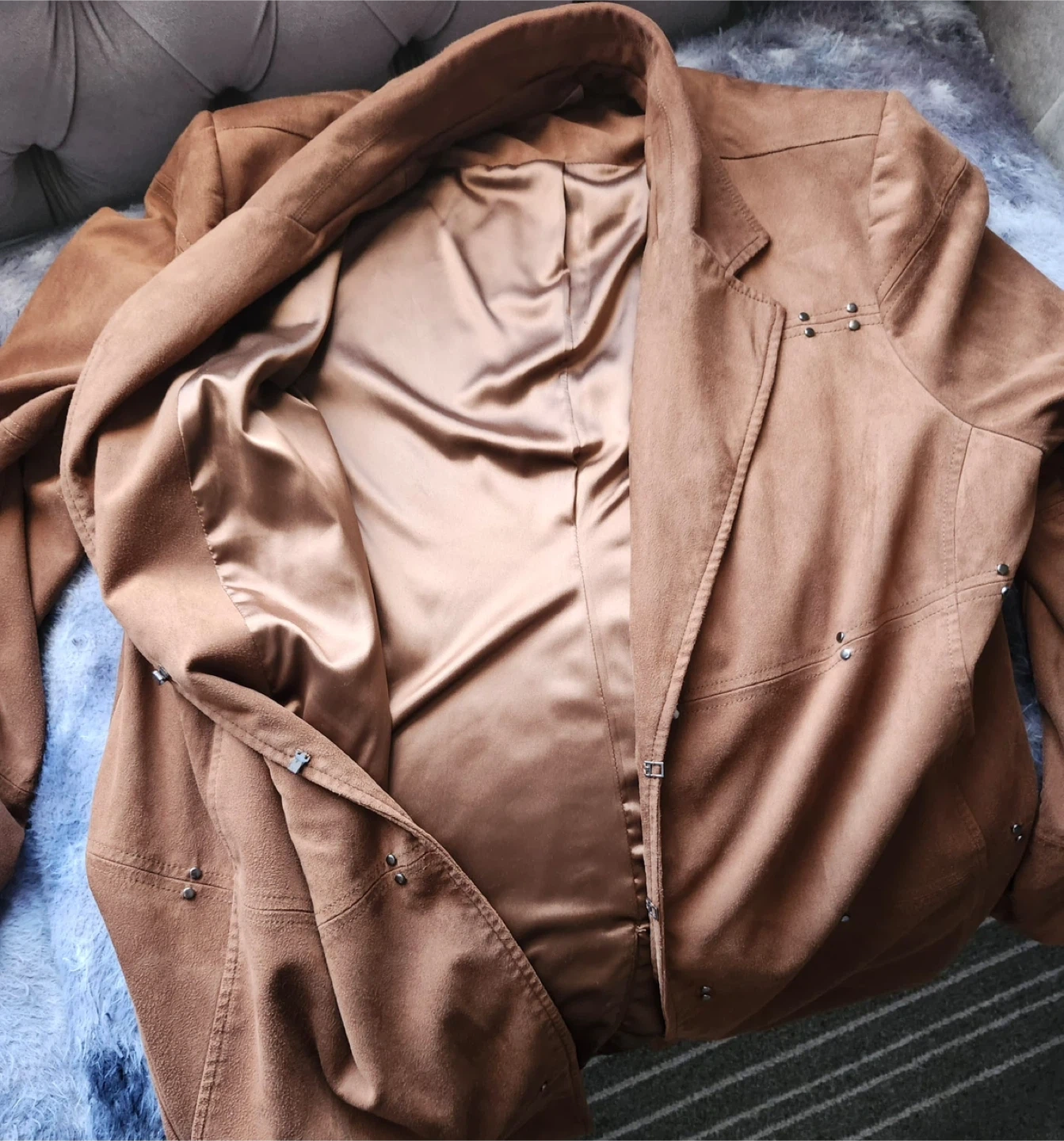 Nice brown blazer from Ralph Lauren. It's made of a soft, suede-like material and has decorative stud accents. The lining is a silky satin fabric.