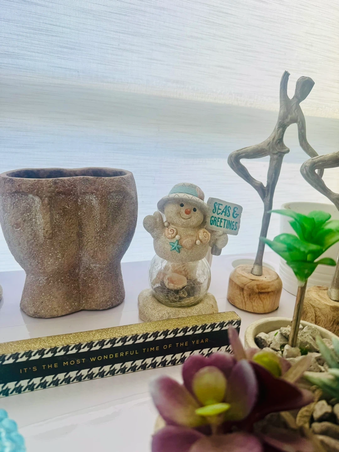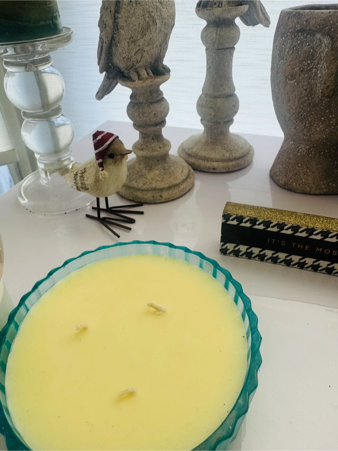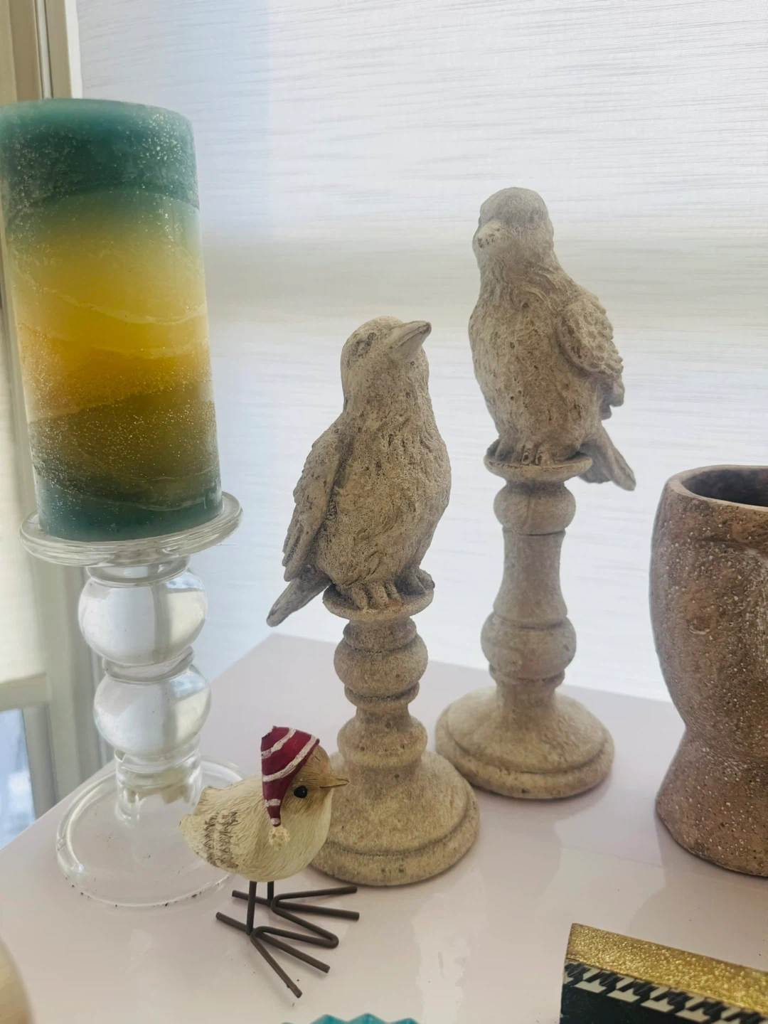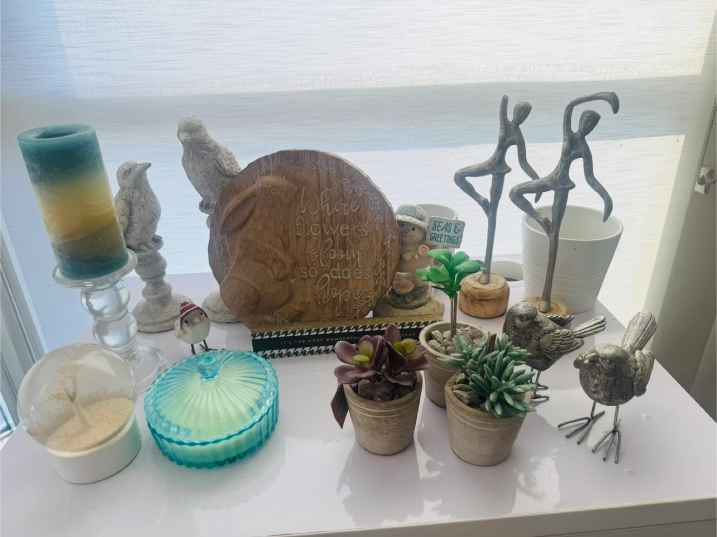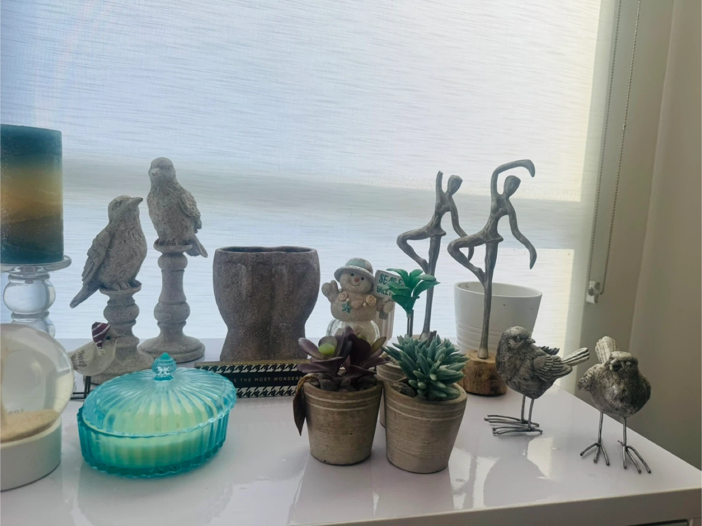 A collection of charming decorative items including several bird figurines, a decorative candle holder with a blue and yellow candle, and a round glass-lidded container that appears to be a candle. Also includes a unique snow globe and small potted succulents. Perfect for adding a touch of whimsical decor to any shelf or tabletop!