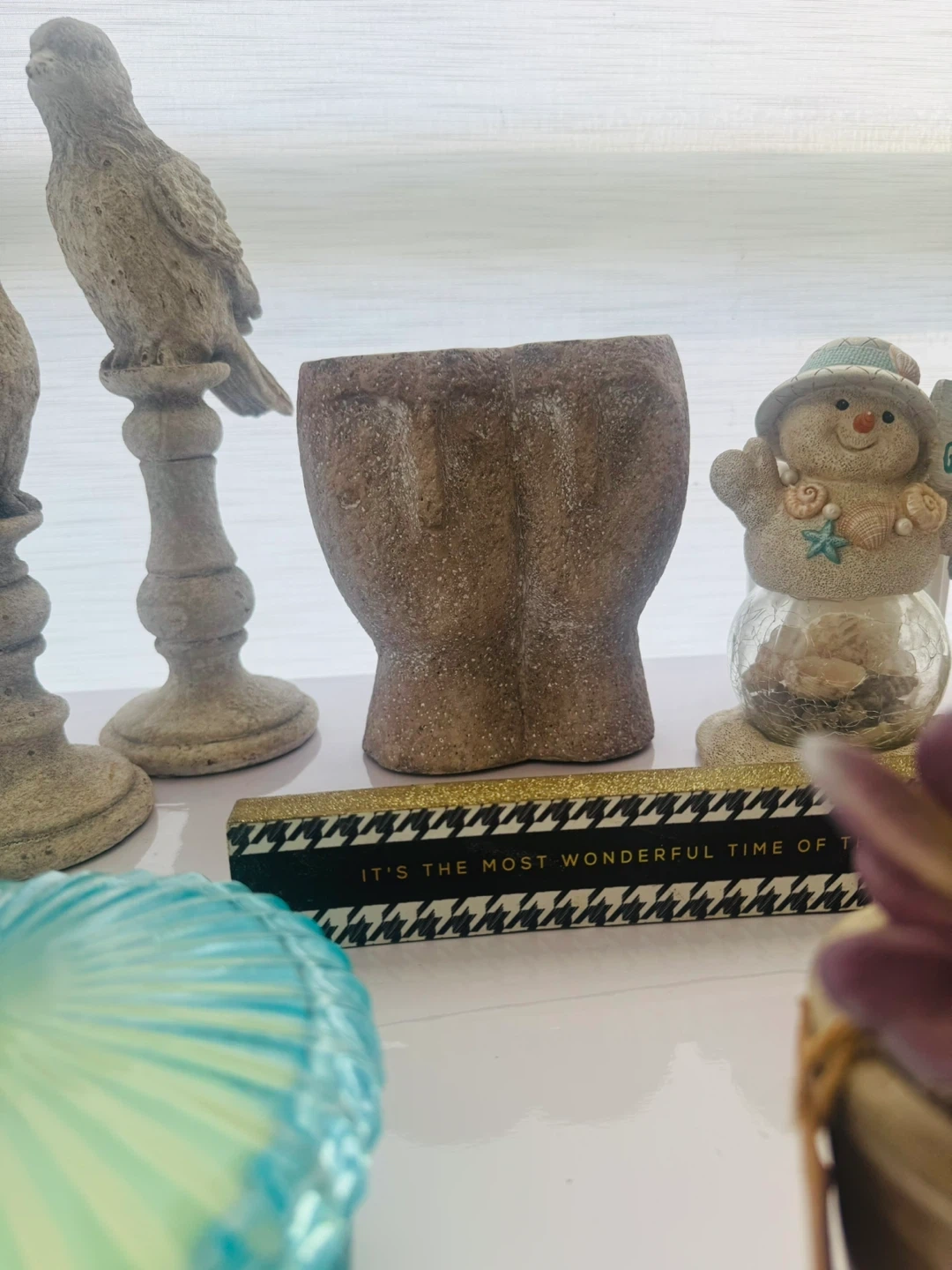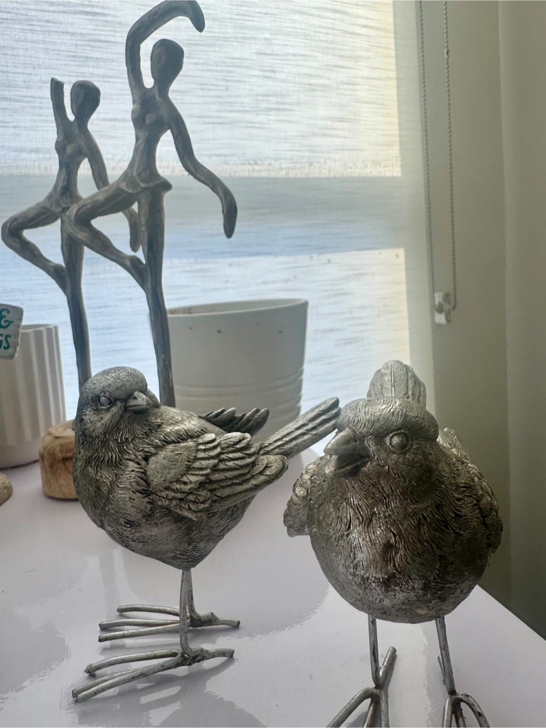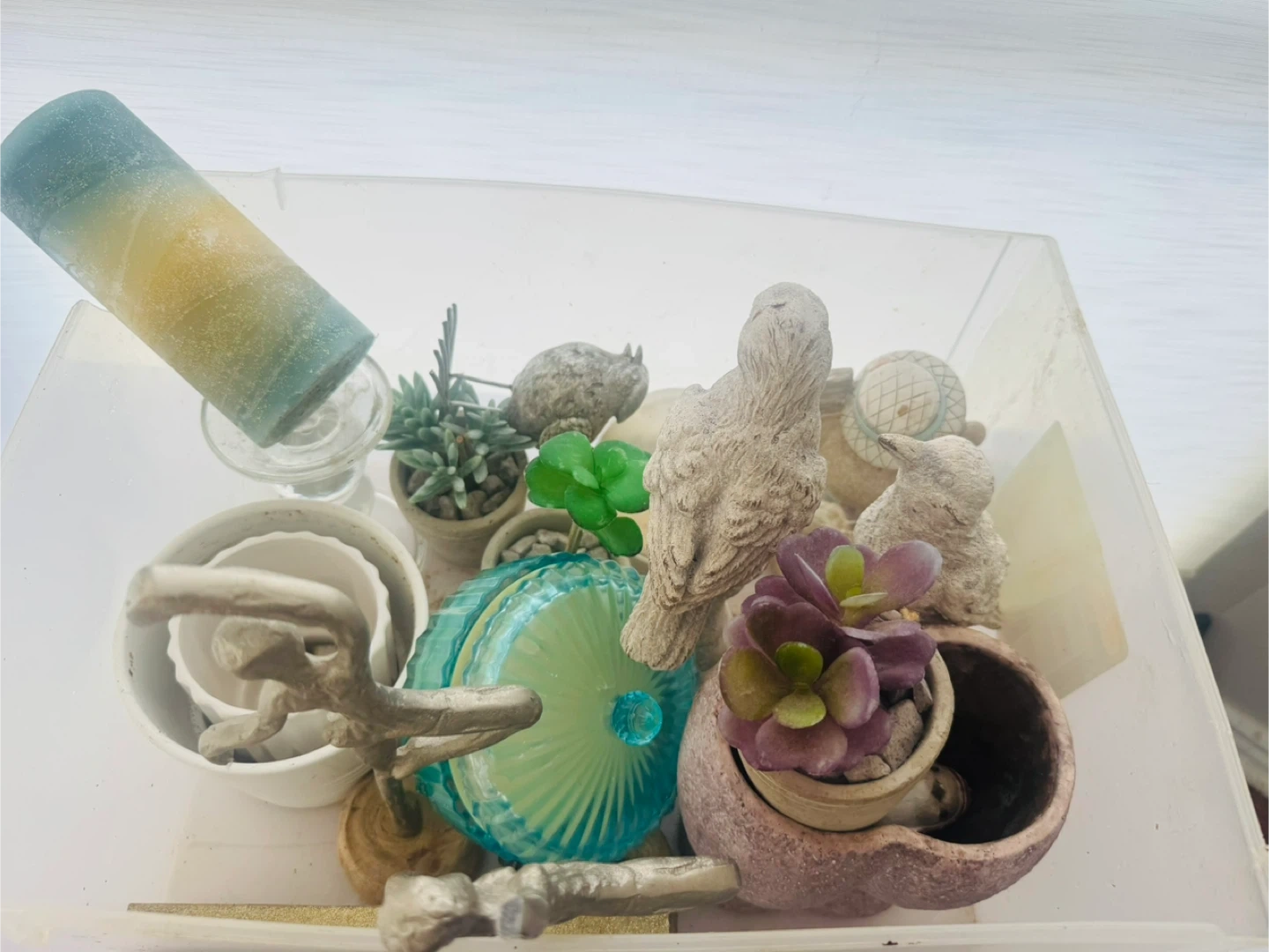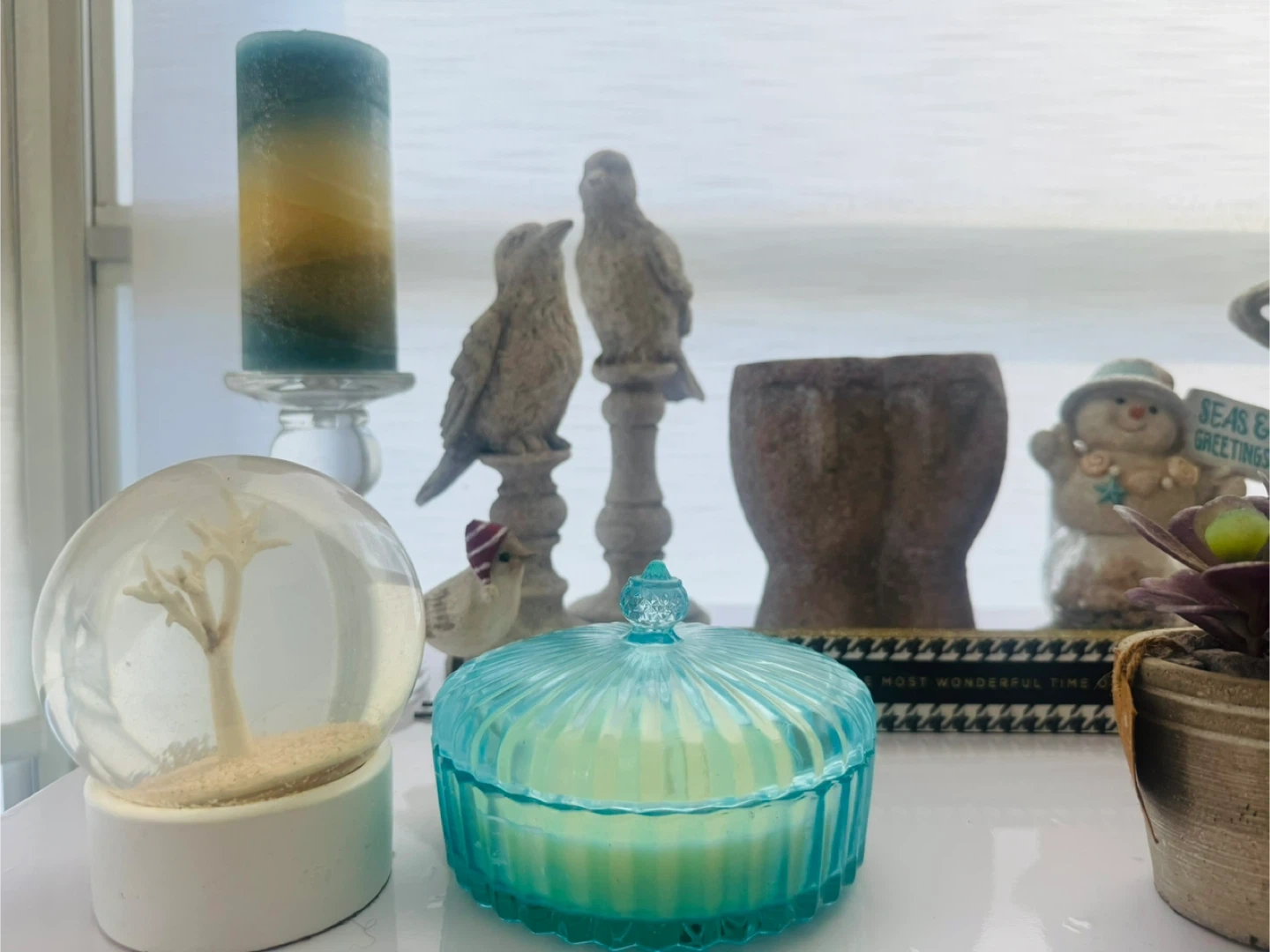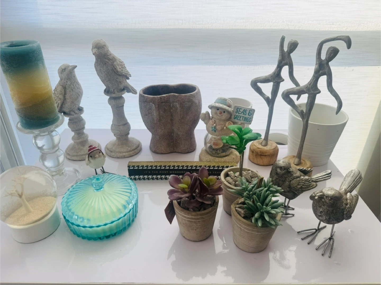 A collection of charming decorative items including several bird figurines, a decorative candle holder with a blue and yellow candle, and a round glass-lidded container that appears to be a candle. Also includes a unique snow globe and small potted succulents. Perfect for adding a touch of whimsical decor to any shelf or tabletop!