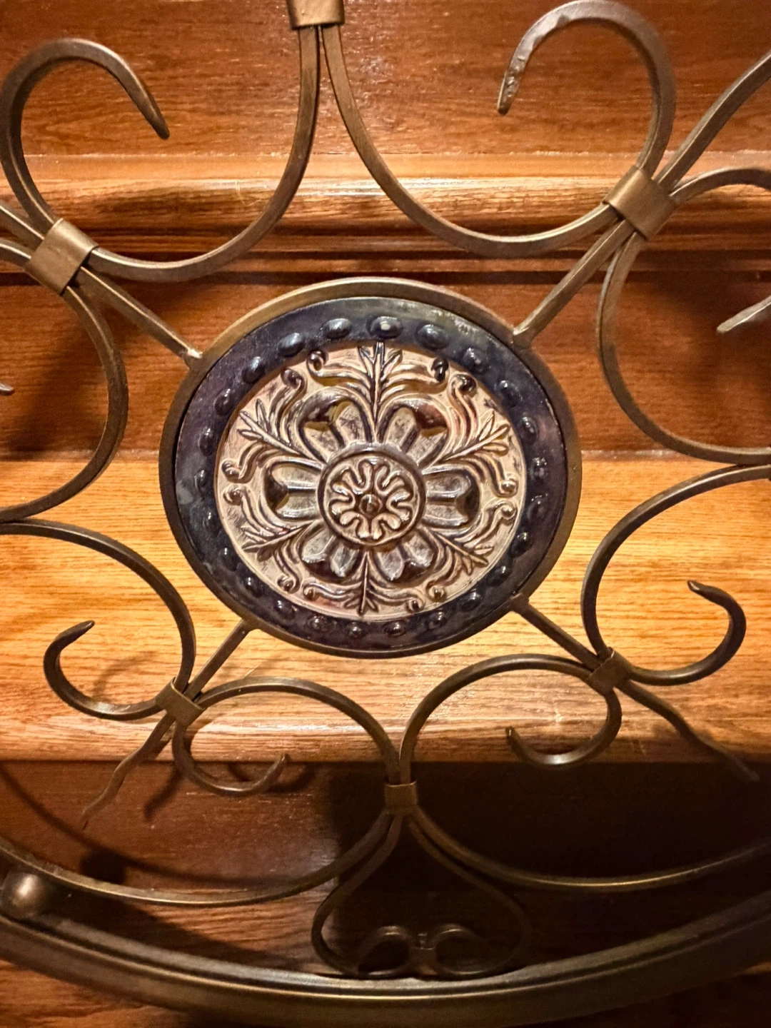 Decorative round metal wall art featuring an ornate scrolled design. The centrepiece is a circular medallion with a floral embossed pattern. Metal construction with a bronze-like finish. It's a lovely piece to add to any room!