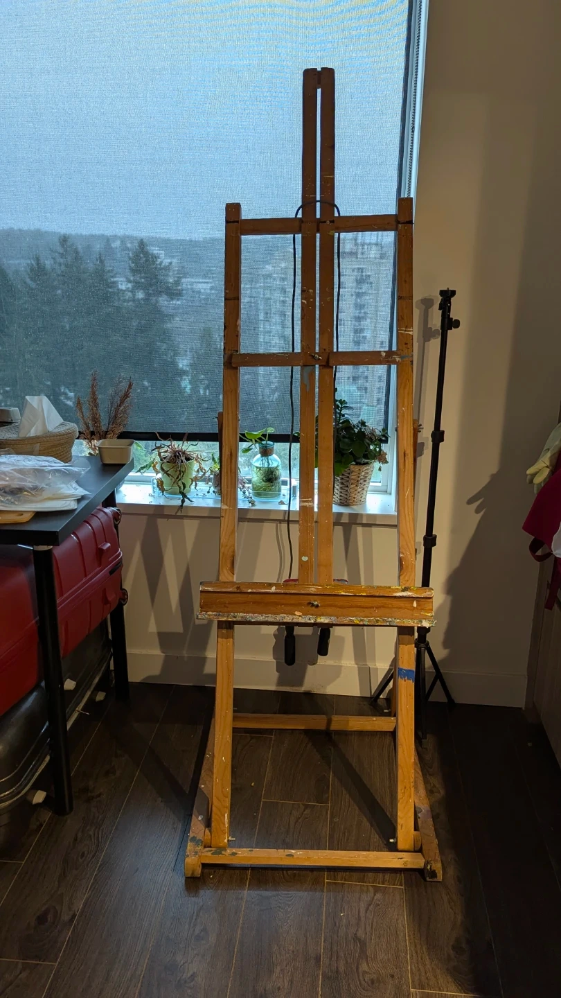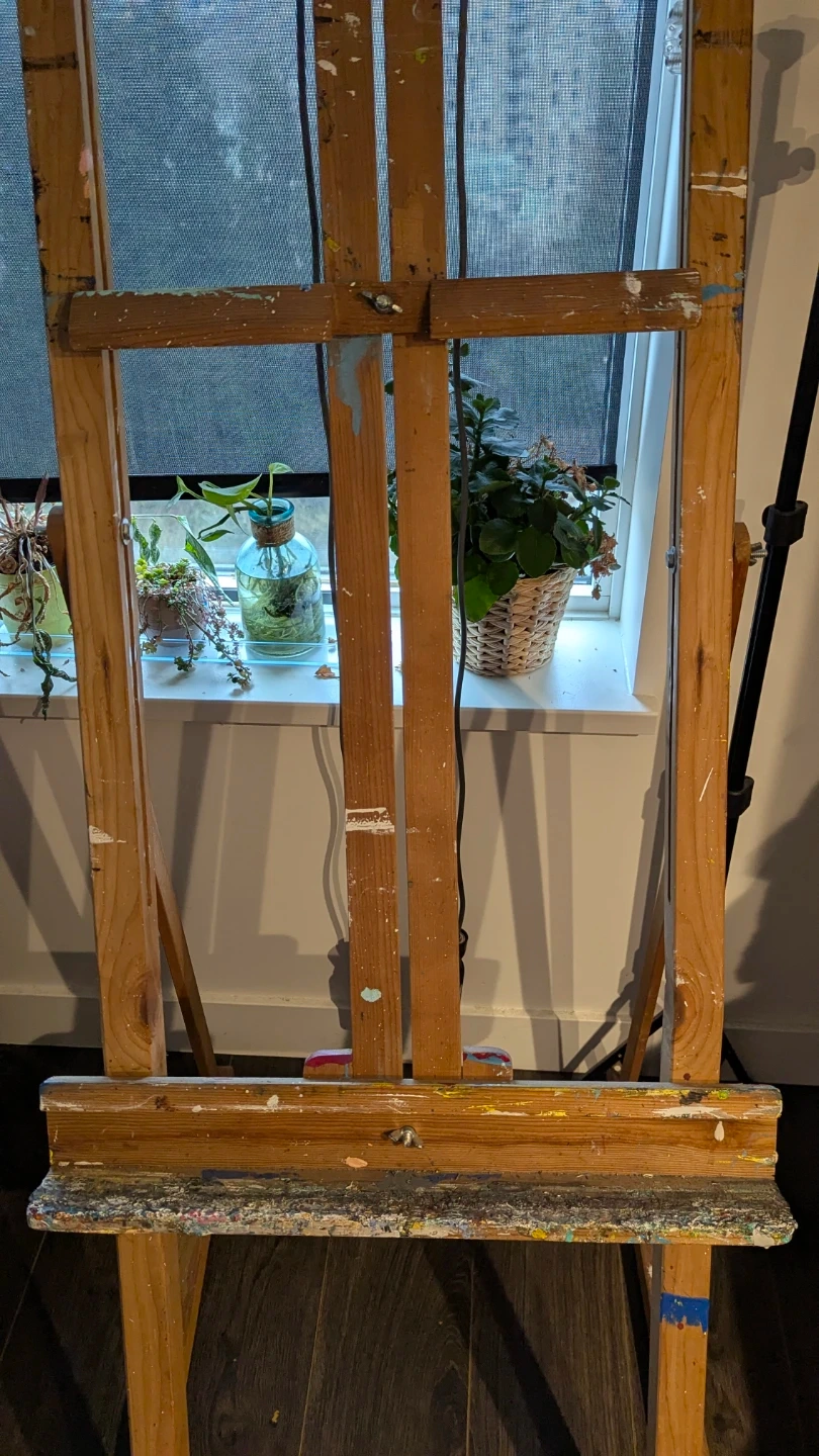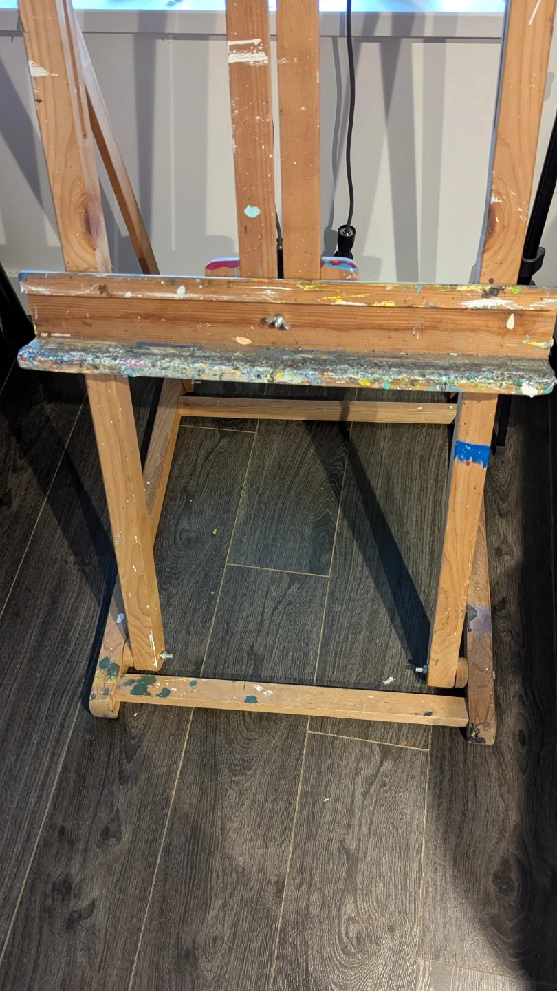 Wooden art easel for painting and display. It's made of solid wood and is adjustable. It's suitable for artists working on canvases of various sizes. Everything works well, it's been used for long amd some adjustments are slightly weary.