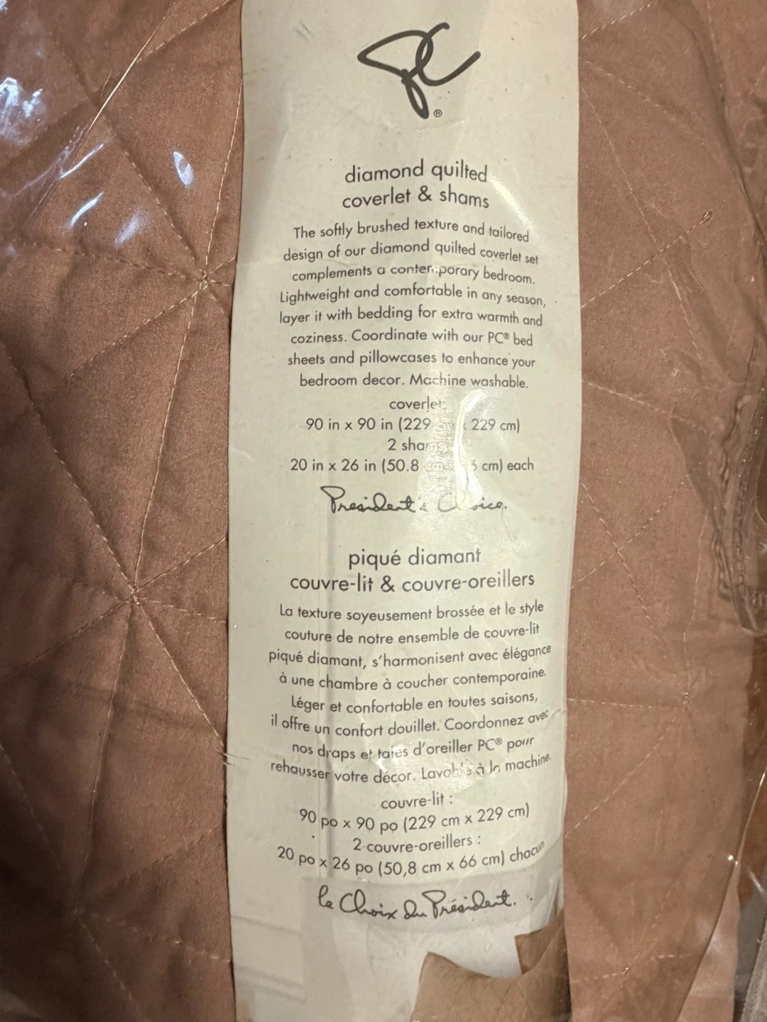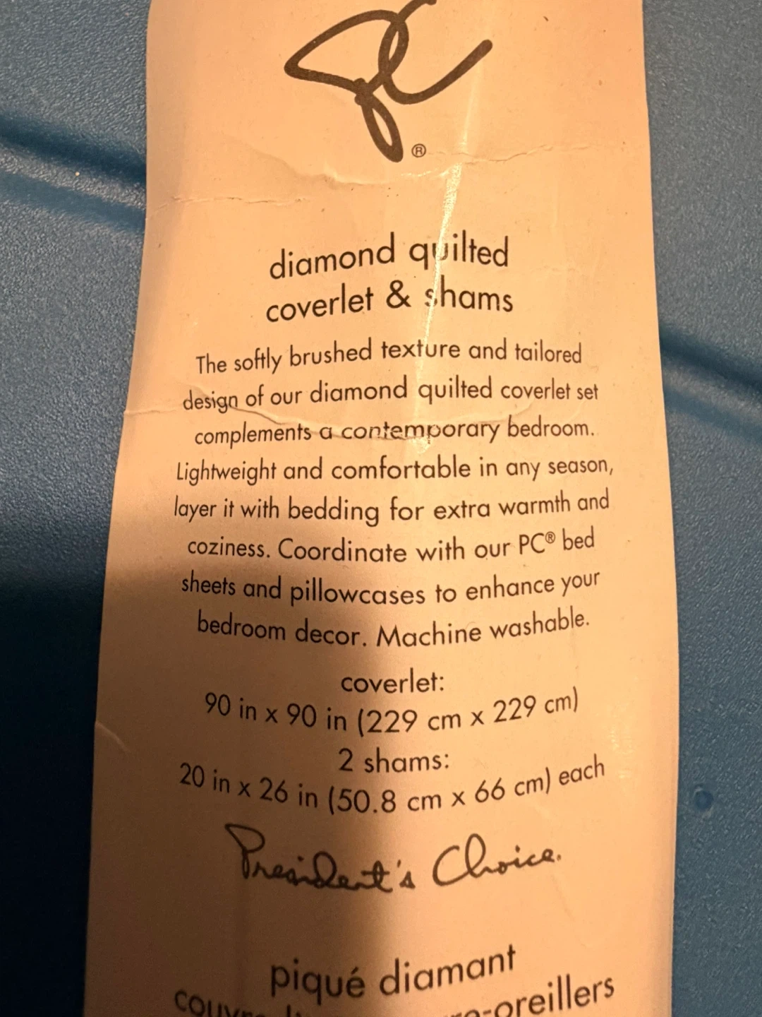 This diamond quilted coverlet and sham set features a softly brushed texture. It's lightweight and comfortable for any season. Coverlet: 90 x 90 inches. 2 Shams: 20 x 26 inches each.