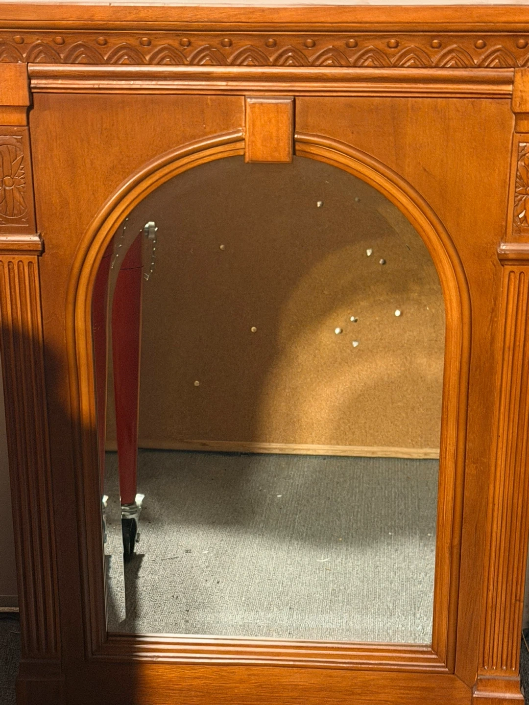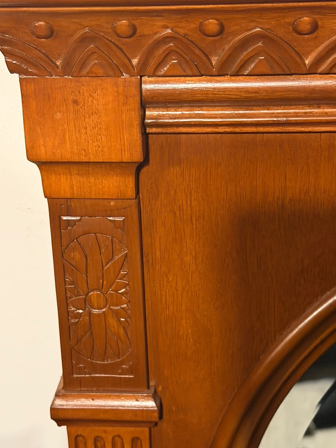 This wooden framed mirror features ornate carved details and a warm wood finish. It's designed with an arched top and decorative molding. This piece would make a lovely addition to an entryway or bedroom.