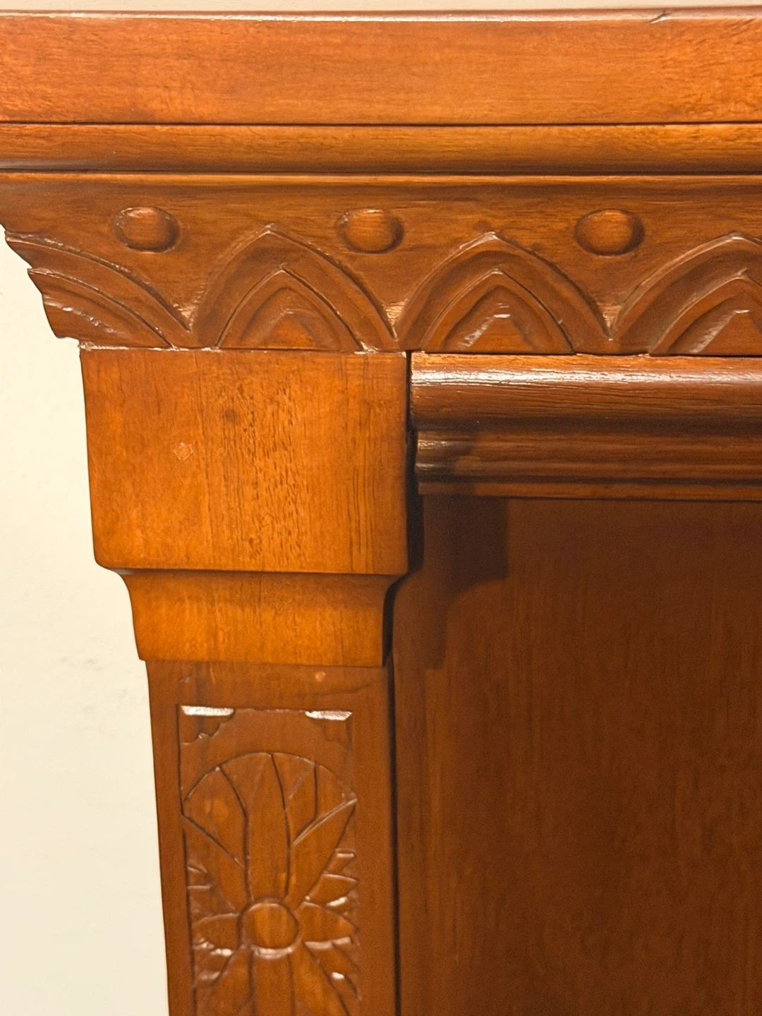 This wooden framed mirror features ornate carved details and a warm wood finish. It's designed with an arched top and decorative molding. This piece would make a lovely addition to an entryway or bedroom.