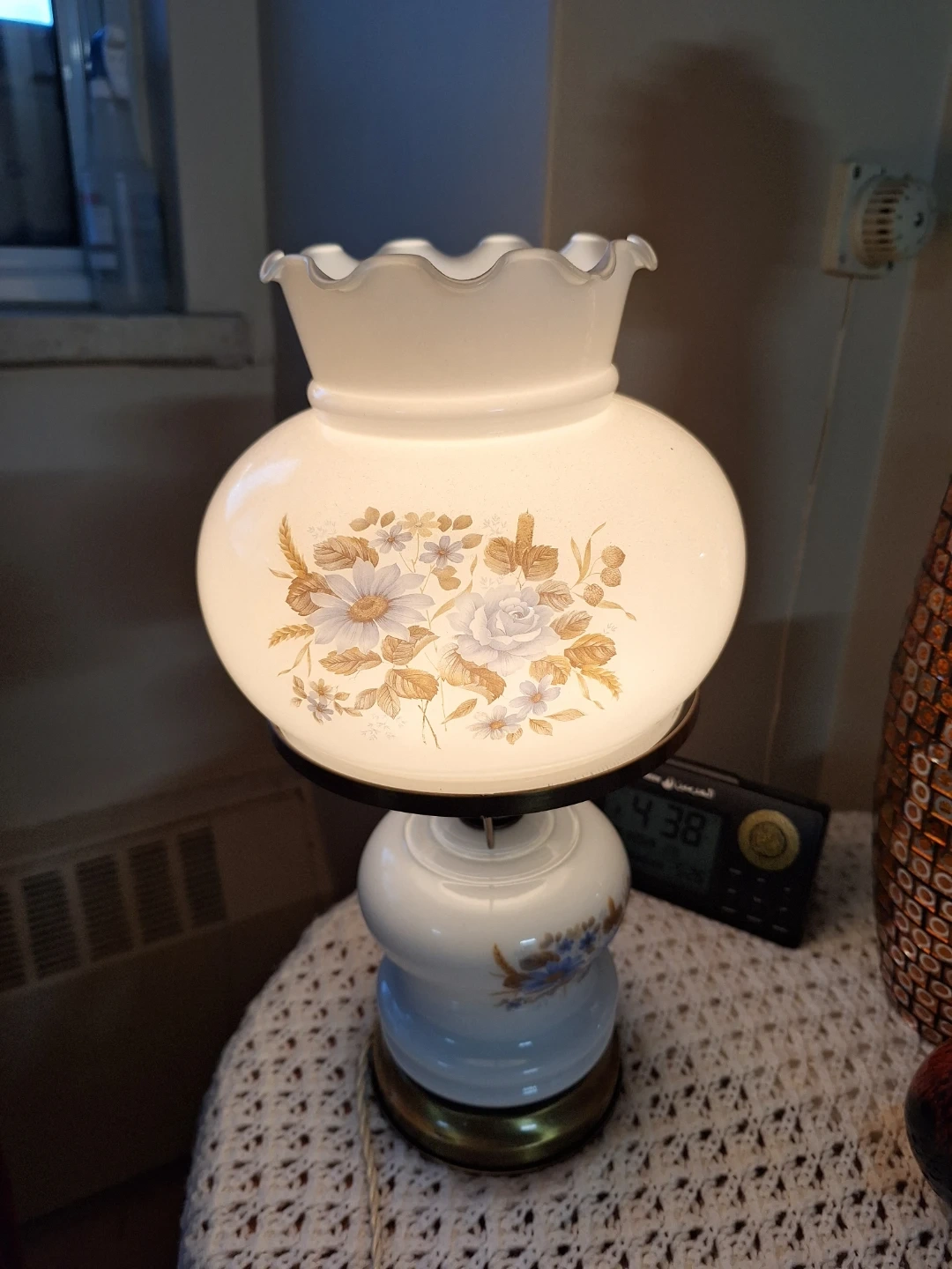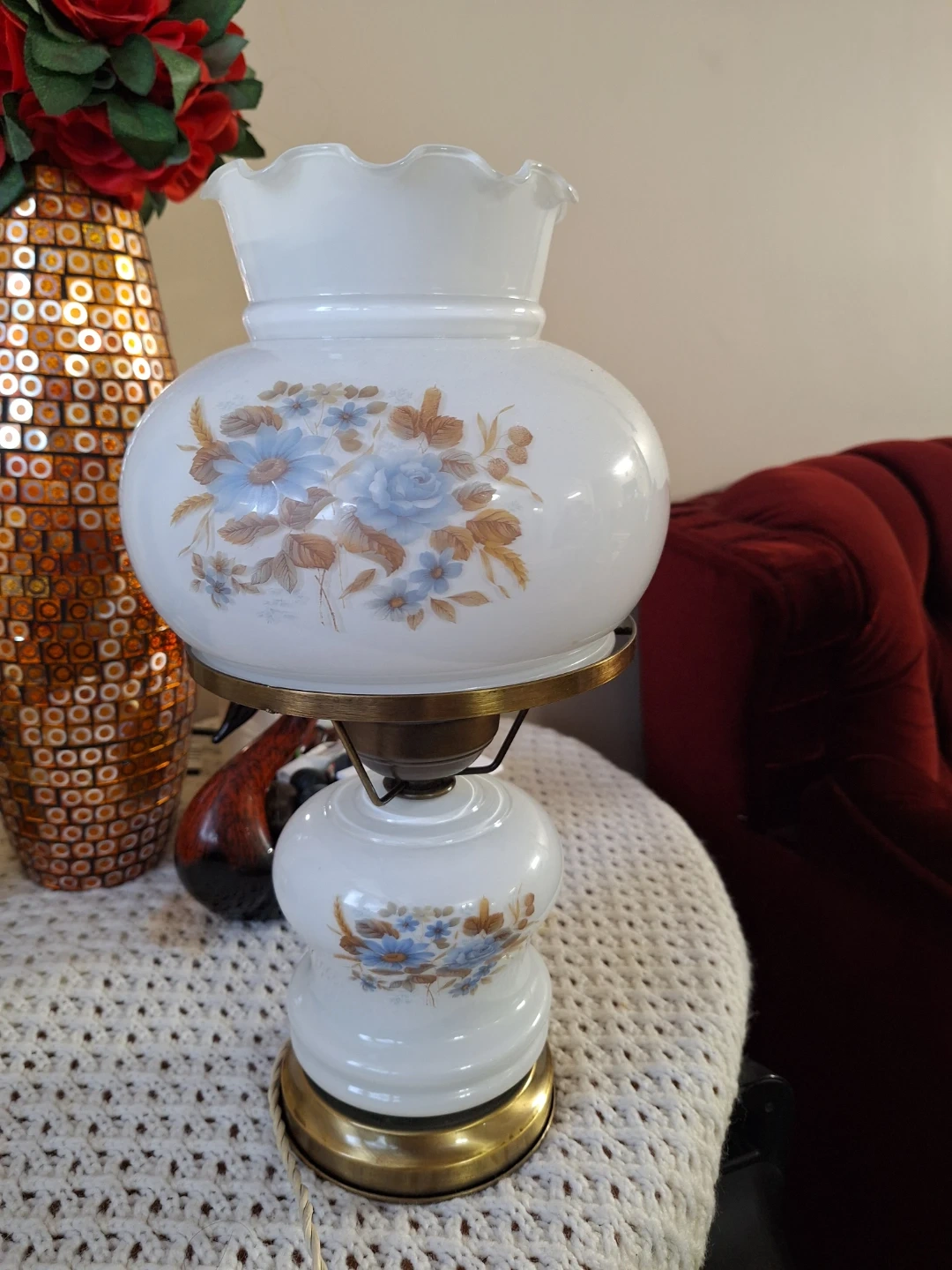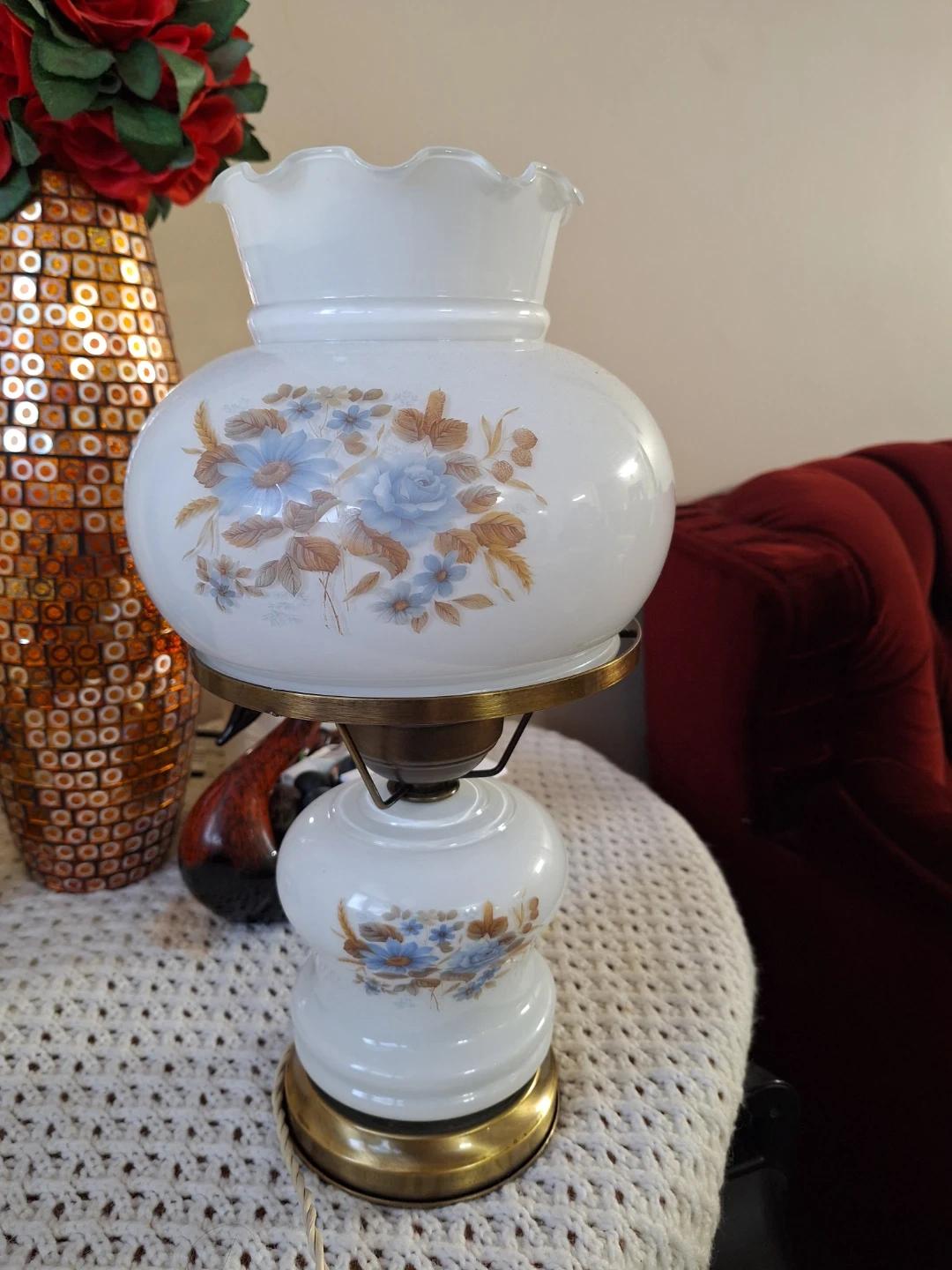 This is a lovely accent lamp with a classic floral design. It has a white glass shade with blue and brown flowers. Its electric.