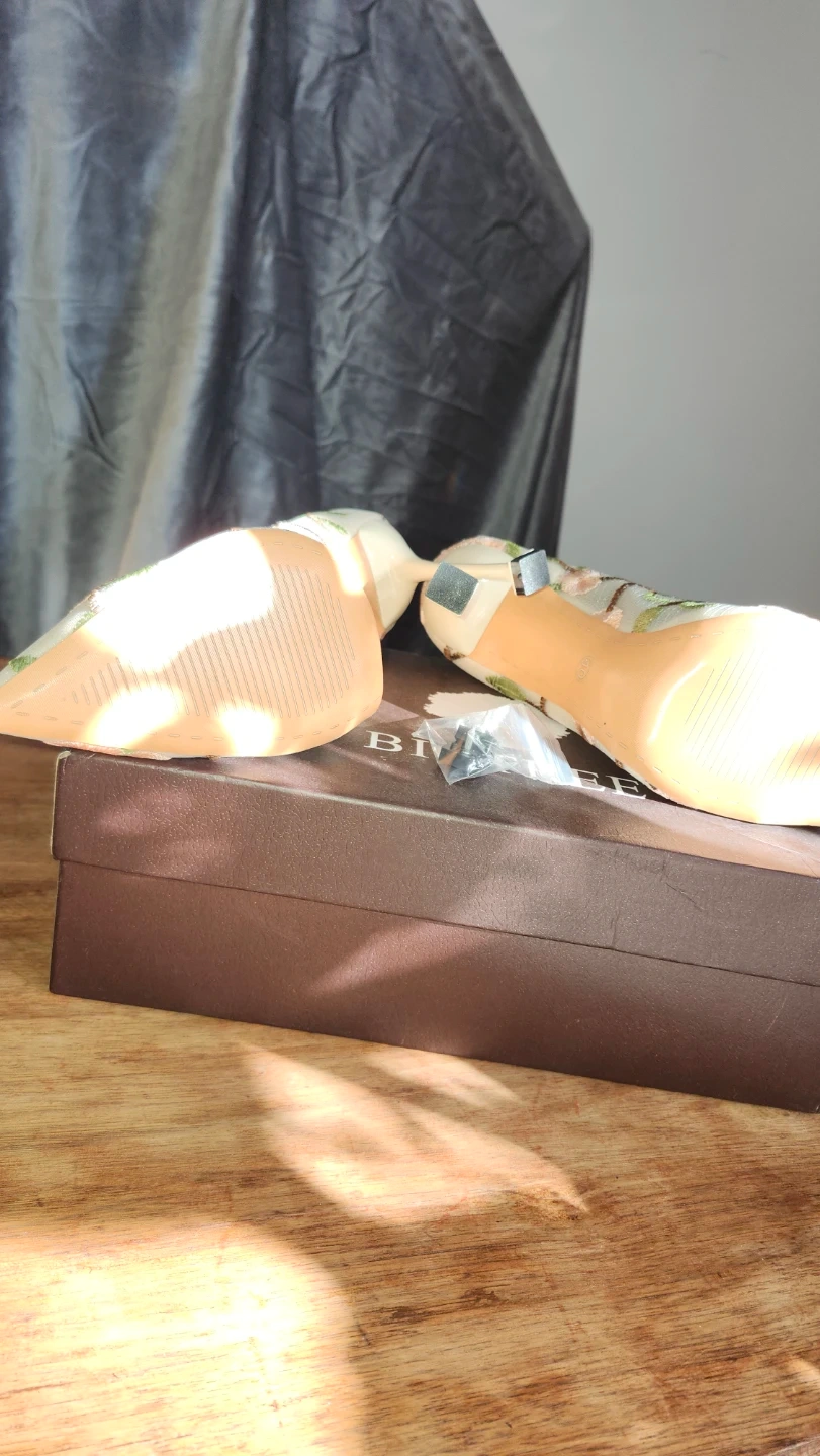 Never worn. Elegant cream-coloured high heel pumps with delicate floral embroidery. These shoes feature a pointed toe and a stiletto heel. They come in their original box with some extra heel tips.