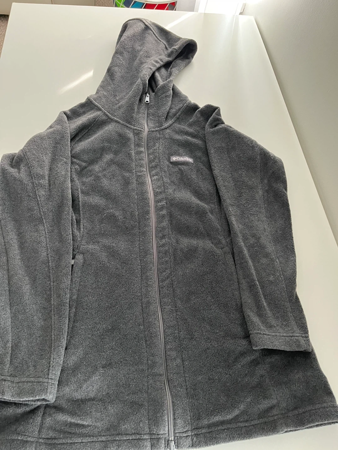 Columbia Sportswear Company fleece jacket in grey. It's a size Large with a hood. Made in Vietnam. This jacket is great for layering on cooler days!